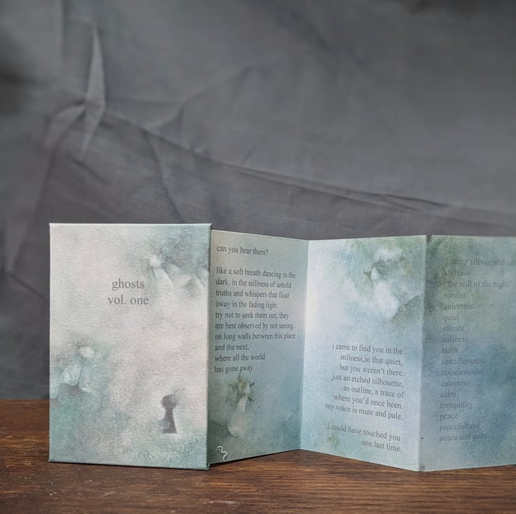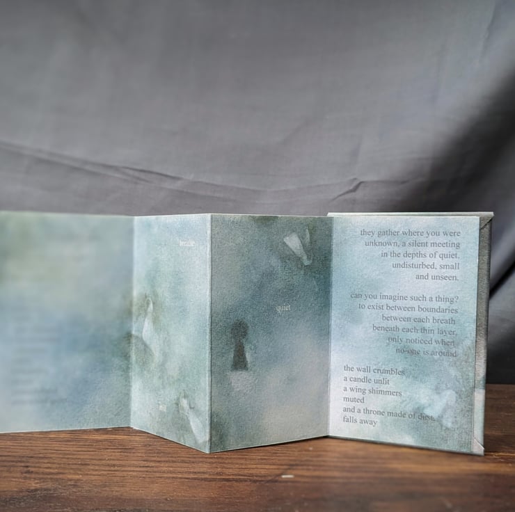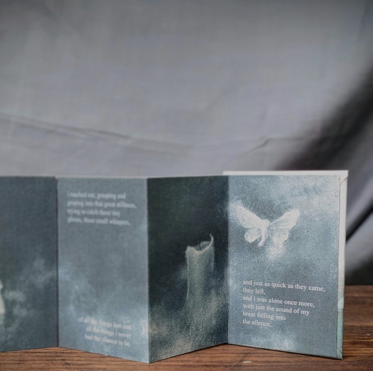 A small concertina artist book, digitally printed and made by hand. Featuring images of moths and words exploring different themes of symbolism. Each one is hand numbered and comes in an edition of 100. The book measures 7x11cm and can be opened up fully for display.