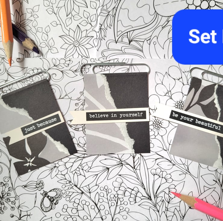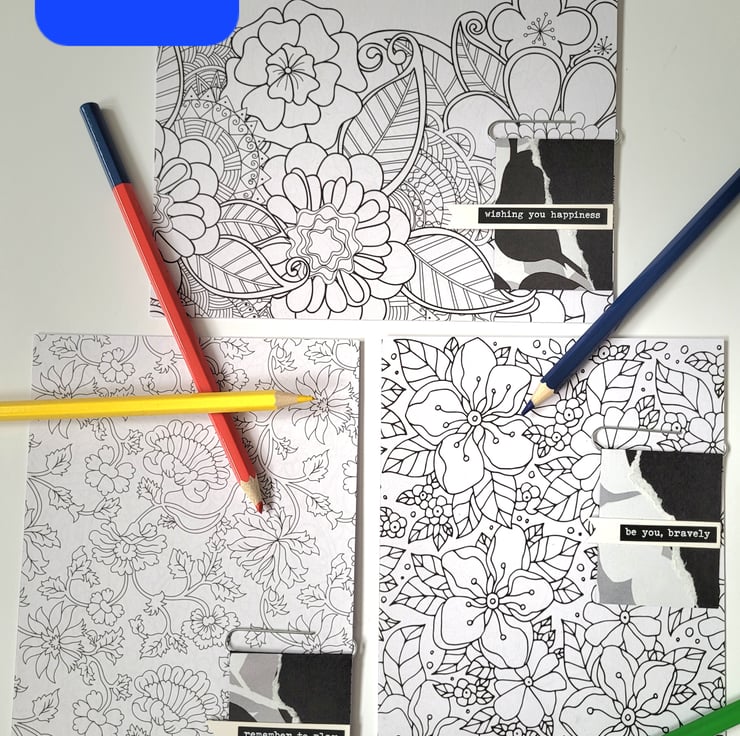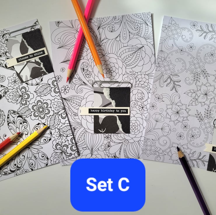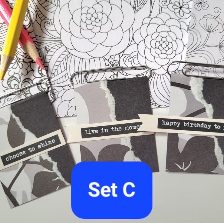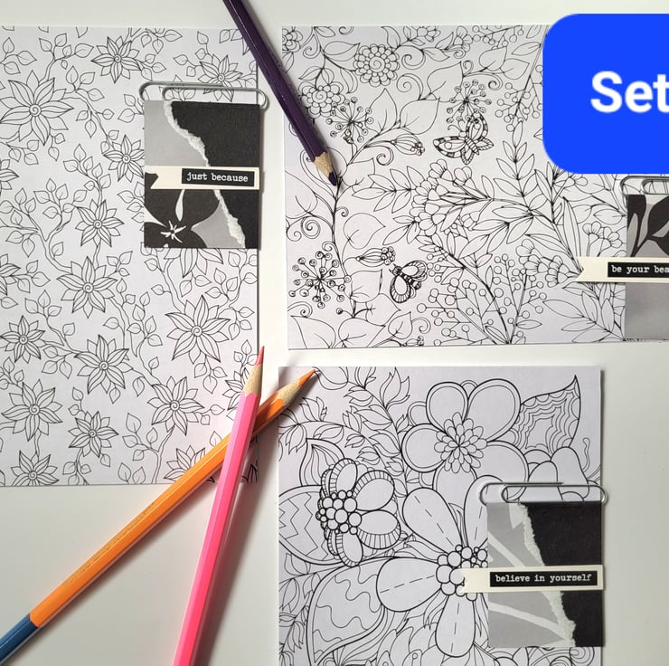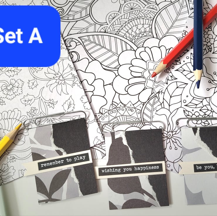 Created using quality colouring pages atop 5x7" / 12.5x17.5cm cardstock. In addition to the cards, each set includes 3 paperclip sentiments which can be attached to any of the cards in either a portrait or landscape orientation. The paperclip sentiments can also double up as keepsakes to be used as page markers, journal tabs, gift tags or planner clips.