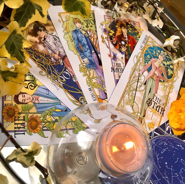 I created these stylised Art Nouveau inspired SHINee tarot cards from scratch, front and back. It was a labour of love and took a long time to paint! This is a LIMITED EDITION, collectible run of prints so I won t be producing more than a few hundred prints of this set.
