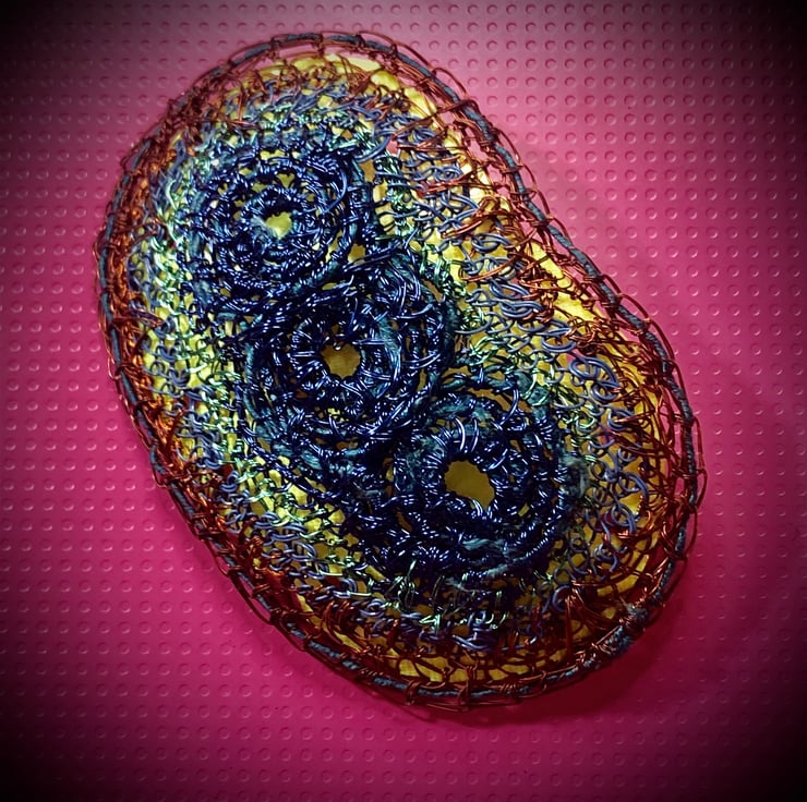 Small hairclasp with blue wire and copper wire from old televisions and vintage embroidery thread back with vibrant fluorescent fabric from a windsurfing sail, silver plated clasp.