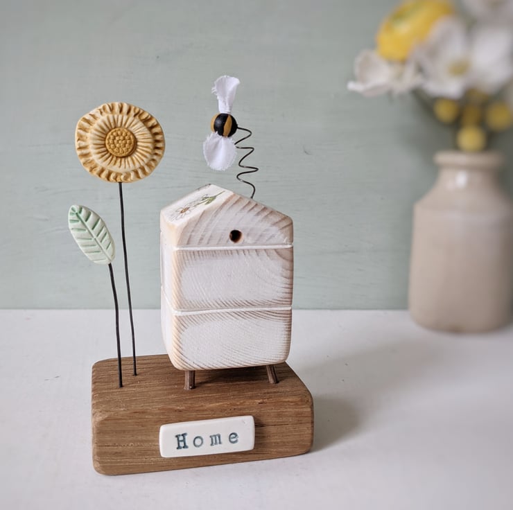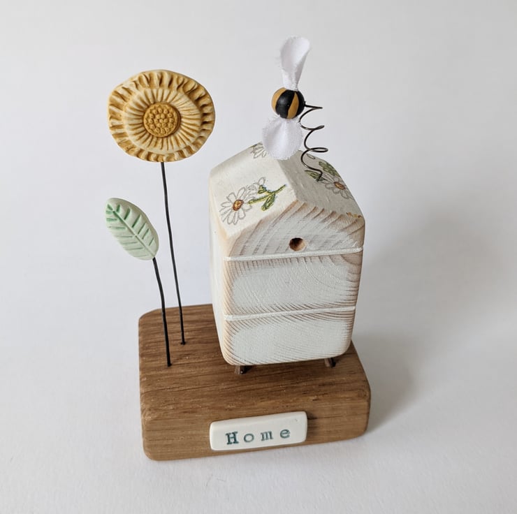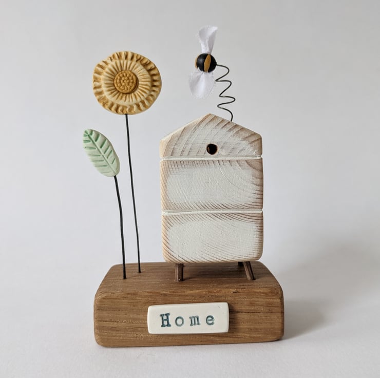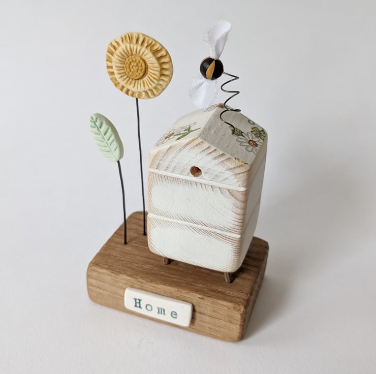 Painted white and sanded smooth it sits on a wooden block with a flower garden. The sign on the front reads 'Home'.