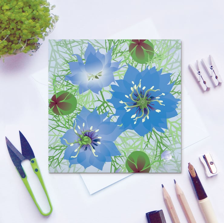 Nigella - Known as 'Love in a Mist' self seeds everywhere to produce masses of fluffy foliage and bright blue flowers with amazing bulbous, rattly seed heads.