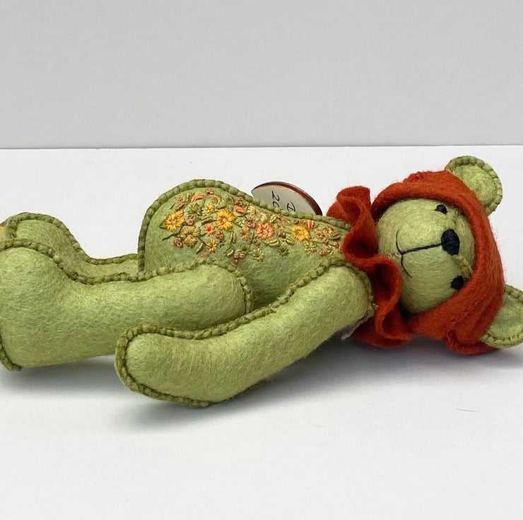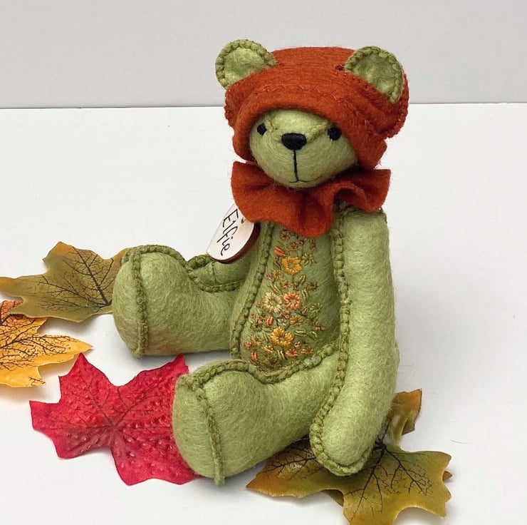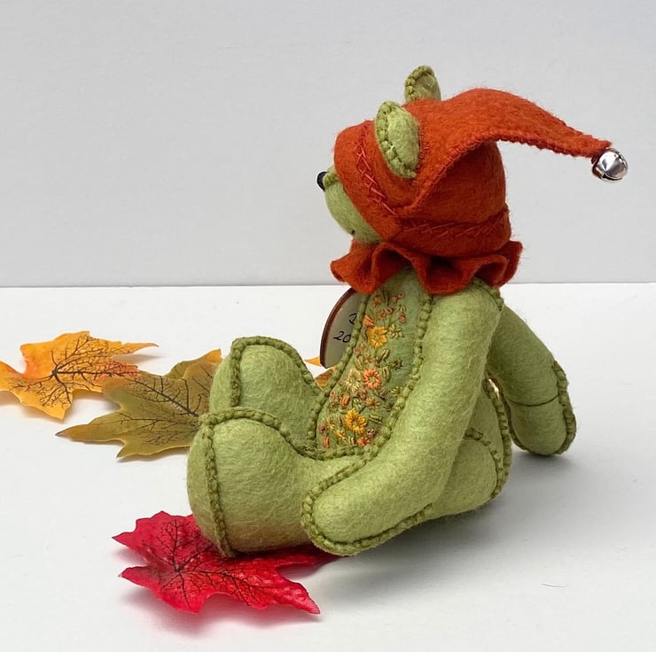 Meet Elfie, a super cute little elf bear, only around 6.5" tall and hand sewn from blended wool felt in kiwi green. With triple sewn seams for extra strength Elfie is quite a little character. Sweet with a butter wouldn't melt look but I think he could be quite a mischievous little bear especially if he thought nobody was watching.