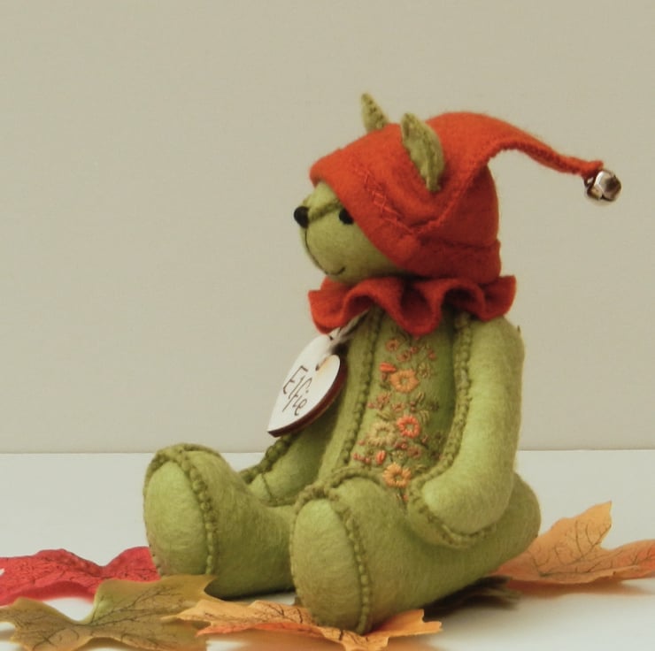 A one of a kind collectable teddy bear, handmade embroidered elf bear, designed and created by Bearlescent.