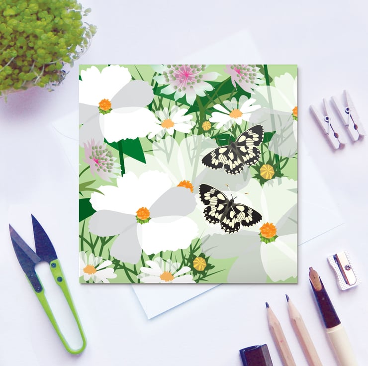 Elegant White Cosmos - with Daisies, Astrantia and two Marbles White Butterflies.