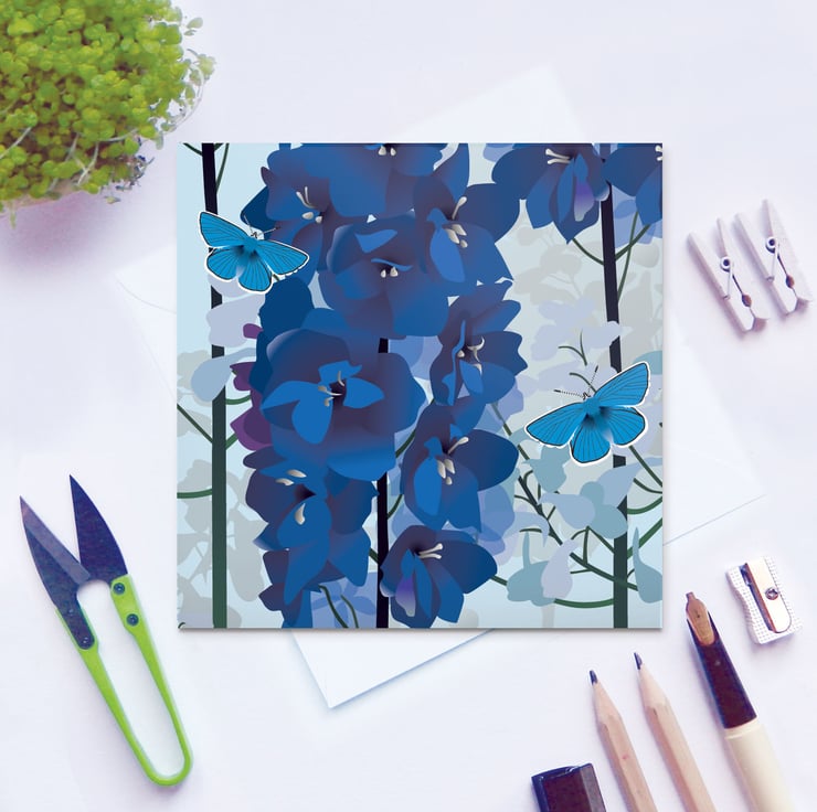 Blue Delphiniums - tall spikes of deep blue with Blue Adonis Butterfly.
