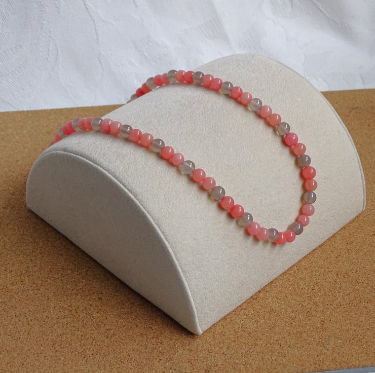 This necklace is made with pink quartzite and grey agate, and is secured with a sterling silver lobster clasp fastening.