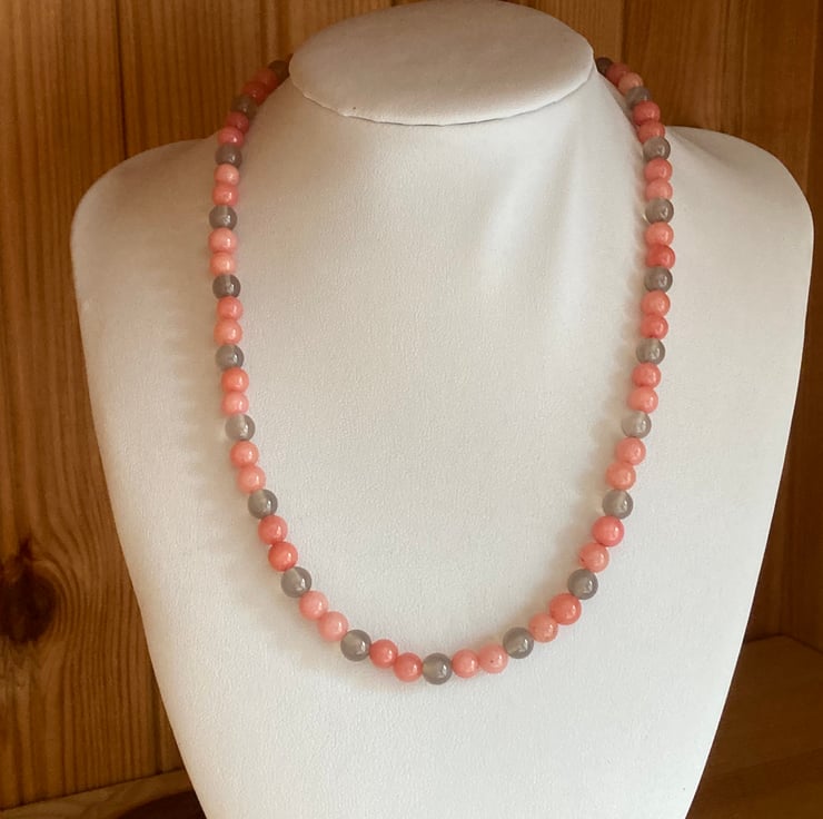 This necklace is made with pink quartzite and grey agate, and is secured with a sterling silver lobster clasp fastening.