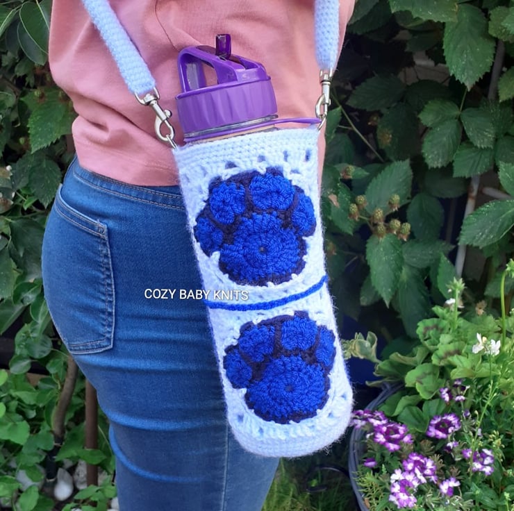 Crossbody bottle bag with a dog print design in a granny square. Removable strap.