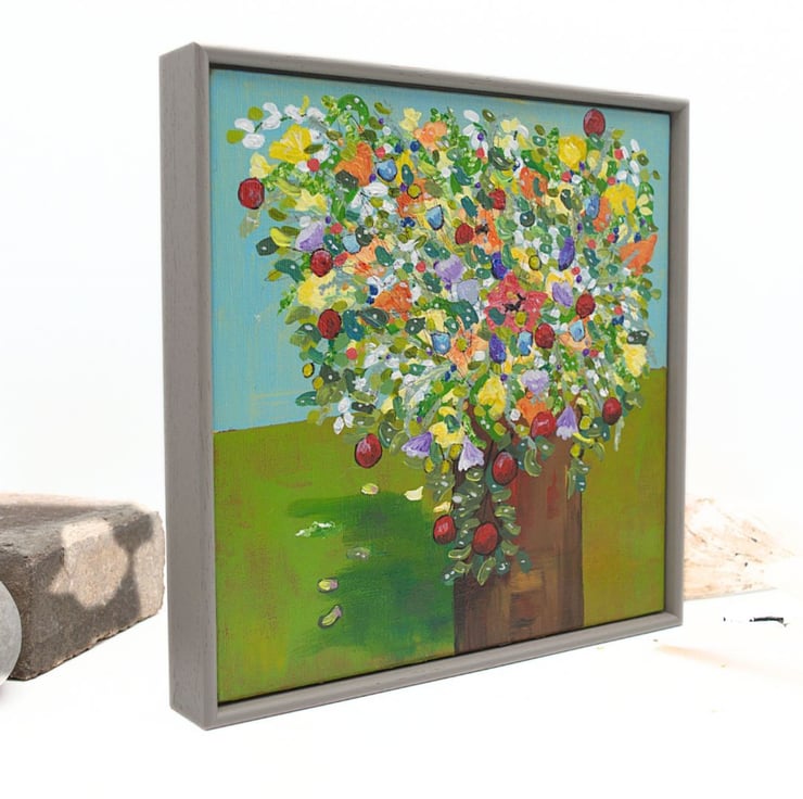 This is a framed acrylic painting of colourful spring flowers. Flowers represent so many things such as joy, peace & memories, old and new. This colourful painting has provided an opportunity to study the form of blooms in different light and shade within a simple backdrop. The flowers are the stars will no fussy background to draw the eye away.