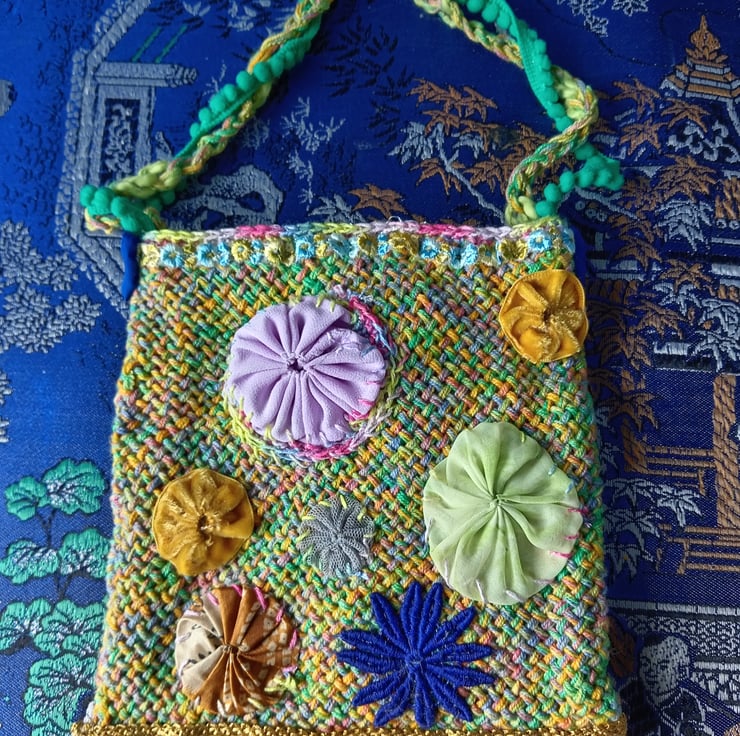 This has been hand woven on a pin loom, then embellished and lined with cream cotton.