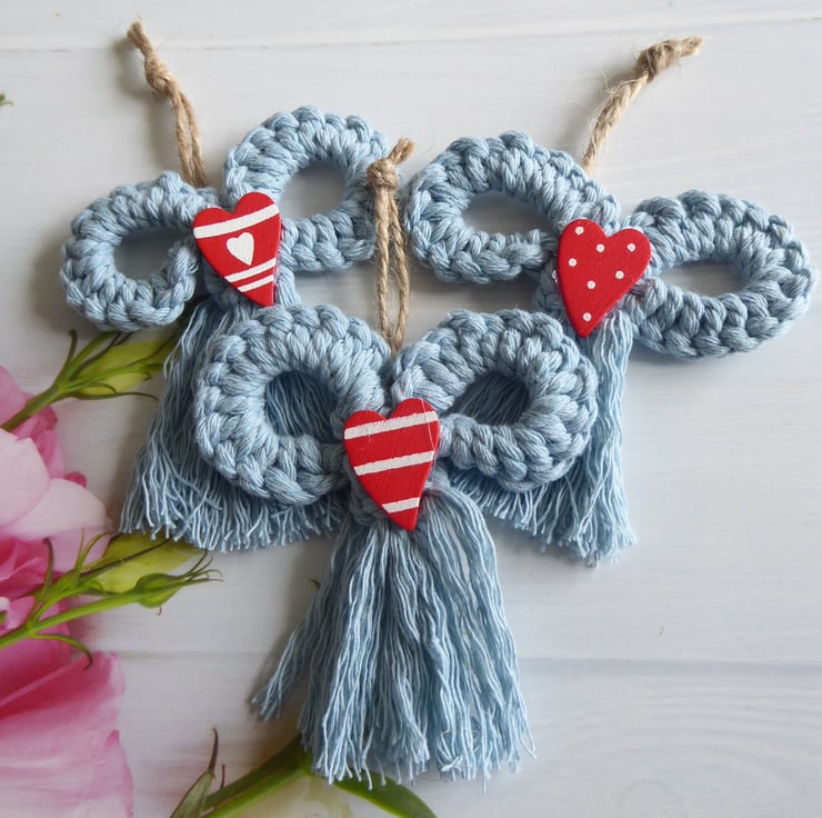 A set of three coordinating macrame bows to decorate your home. Versatile to hang on hooks, as an extra touch for vases, or to place elsewhere in the home. They could even be attached as a gift wrap accessory, or sent as a cute handmade gift.