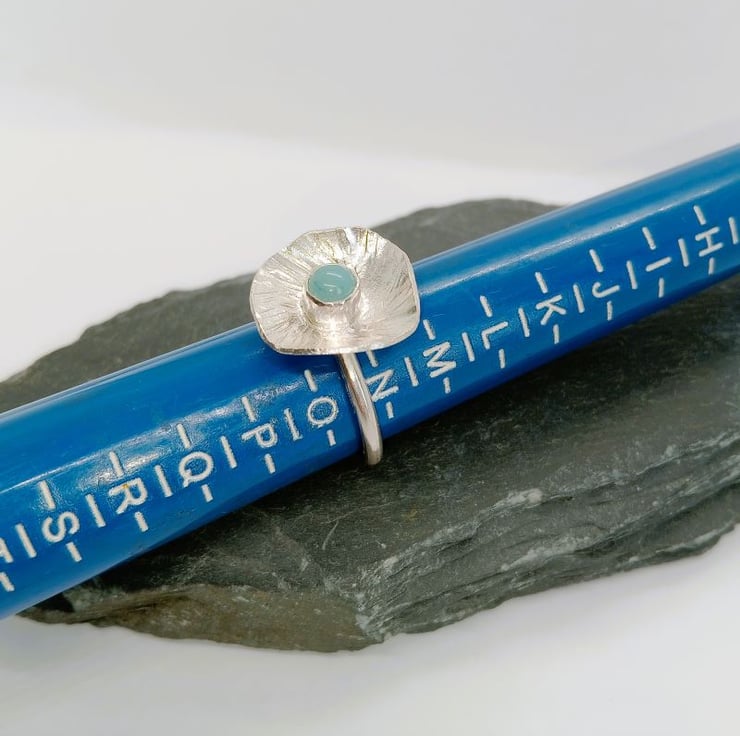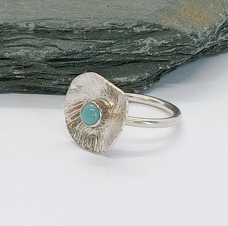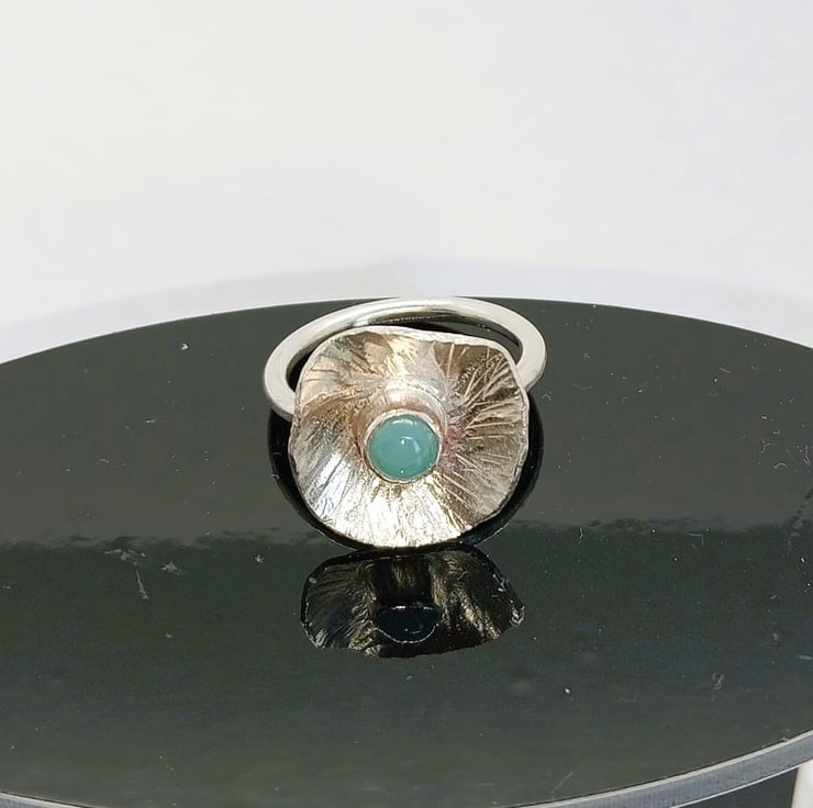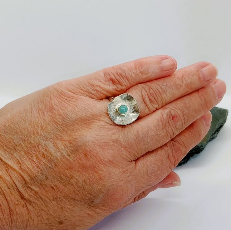 The floral design ring measures aproximately 1.8 cm with curvy outer and decorative line hammered feature as the petals, set in the center is a stunning green/blue 5 mm Amazonite gemstone in a rubover bezel setting.