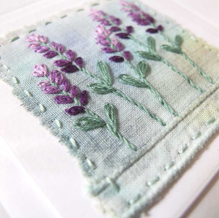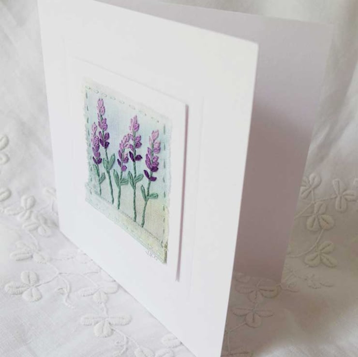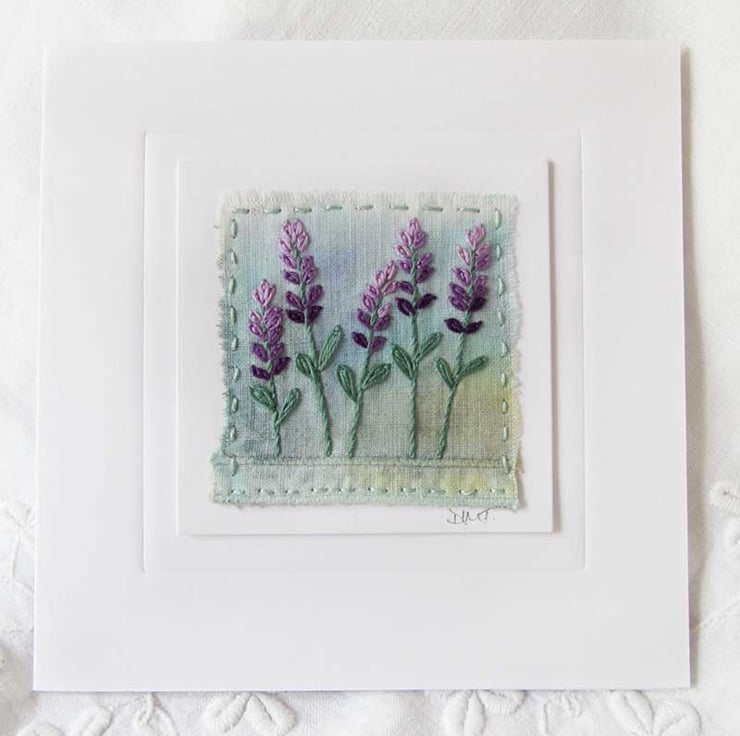 This beautiful card has been embroidered by hand onto fabric that I have dyed in delicate shades of green and aqua. The embroidery design is of Lavender in shades of purple and mauve - perfect for a special occasion, or perhaps framing it as it is. It has been mounted on a card base and is surrounded by an embossed square. The card has been left blank for your own message.