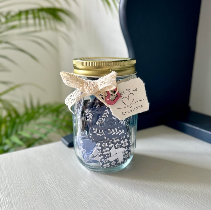 Each affirmation has been folded and tucked inside an origami envelope made from patterned paper in shades of blue - this jar of affirmations has been thoughtfully created with love and care.