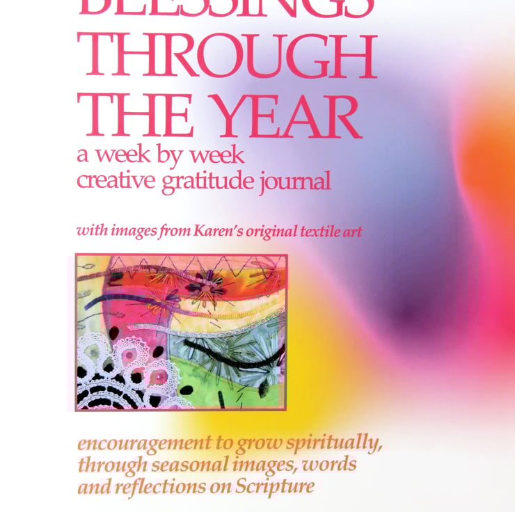 There are 80 pages, full colour, with a page for each week of the year with reflections, images and close up detail from my original textile art & poetry that take us through the seasons, questions to ponder and space to both journal and record your own gratitude for gifts given over the year.