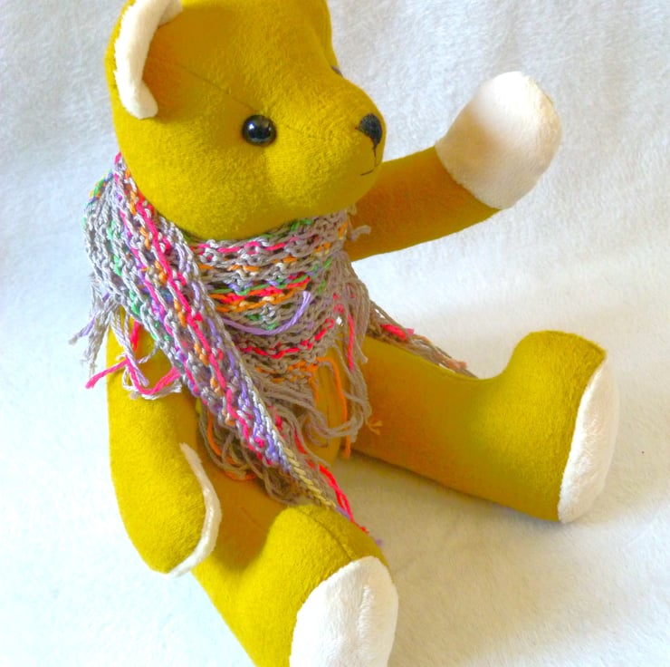 Piccalilli, a cute hand crafted button jointed bear with a knitted cotton shawl