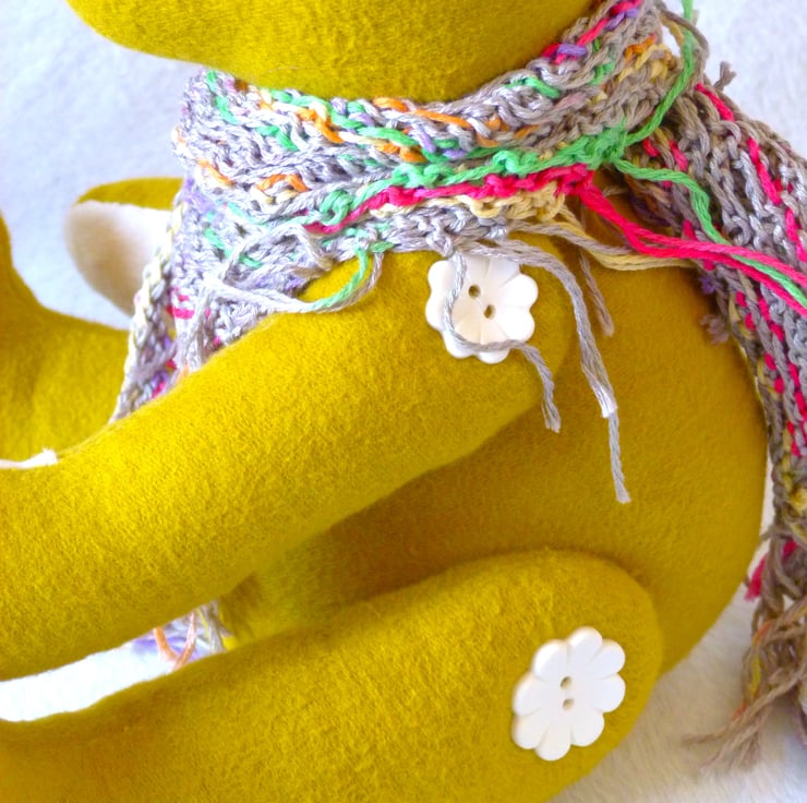 The arms and legs have been button jointed with cute flower buttons and there is a safety joint in the neck. The eyes are black buttons stitched in to sculpt the face and the nose and mouth are hand embroidered.