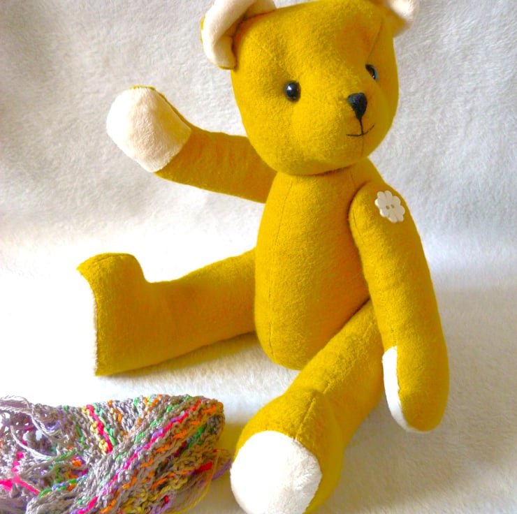 I always look at the fabric and then decide on the type and character of bear will be made. Some of my bears are made from vintage or even antique fabrics. This one is from a remnant of new cotton fleece and I knew the name would be 'Piccalilli' and would have a cheeky character.