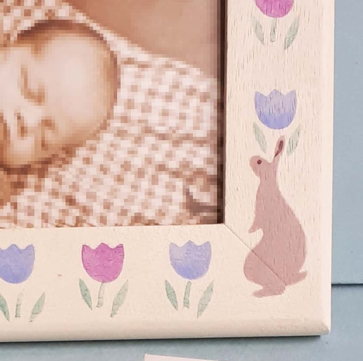 This personalised photo-frame is painted with adorable rabbits on a background of tulips.