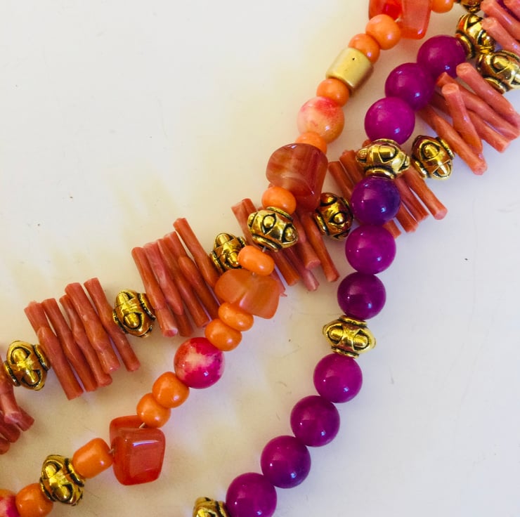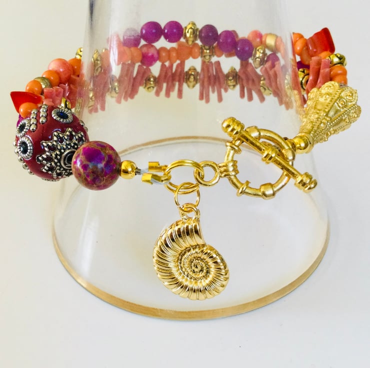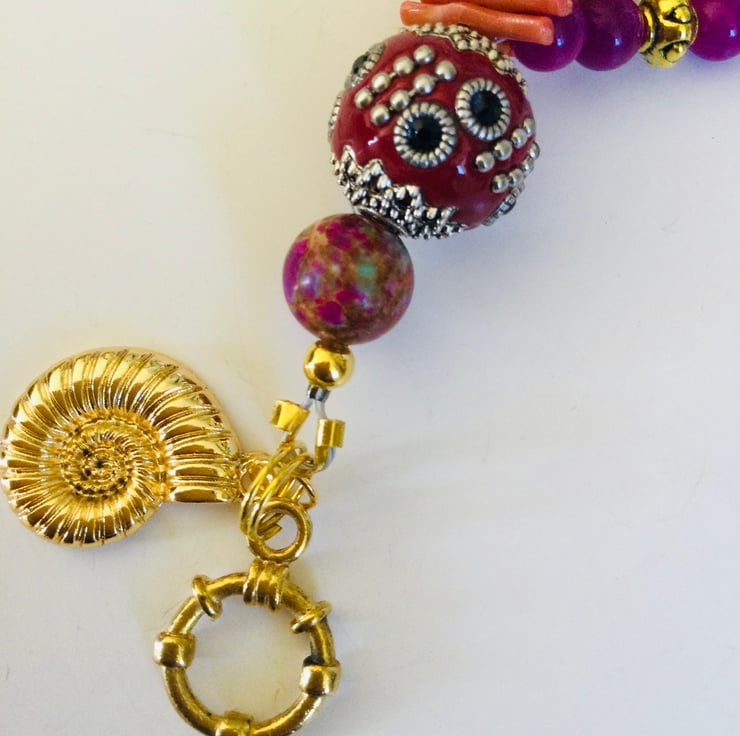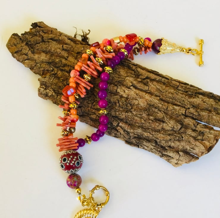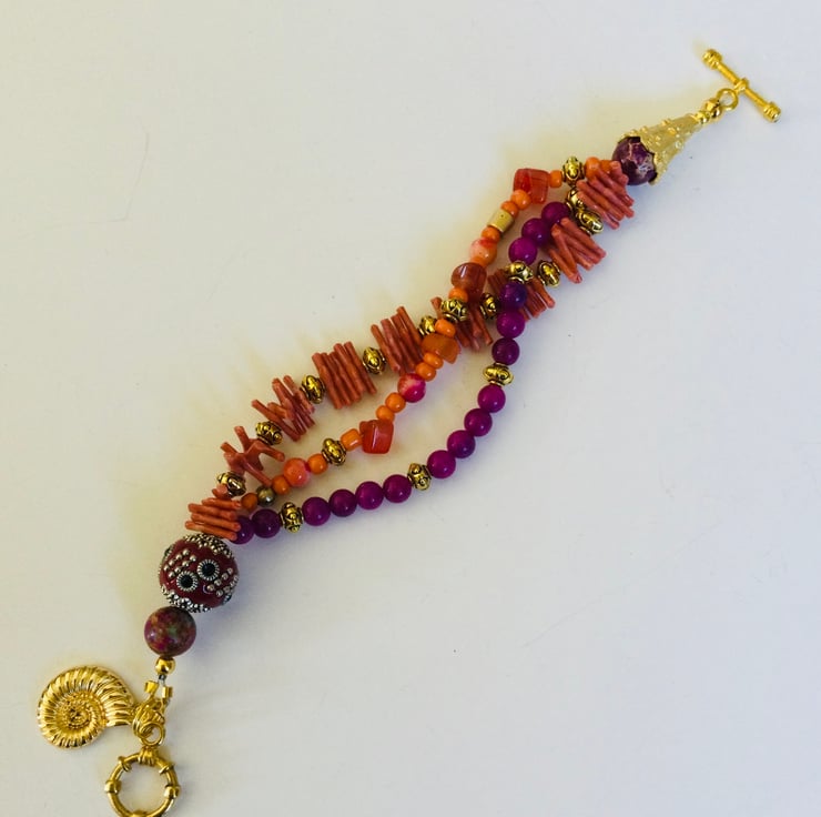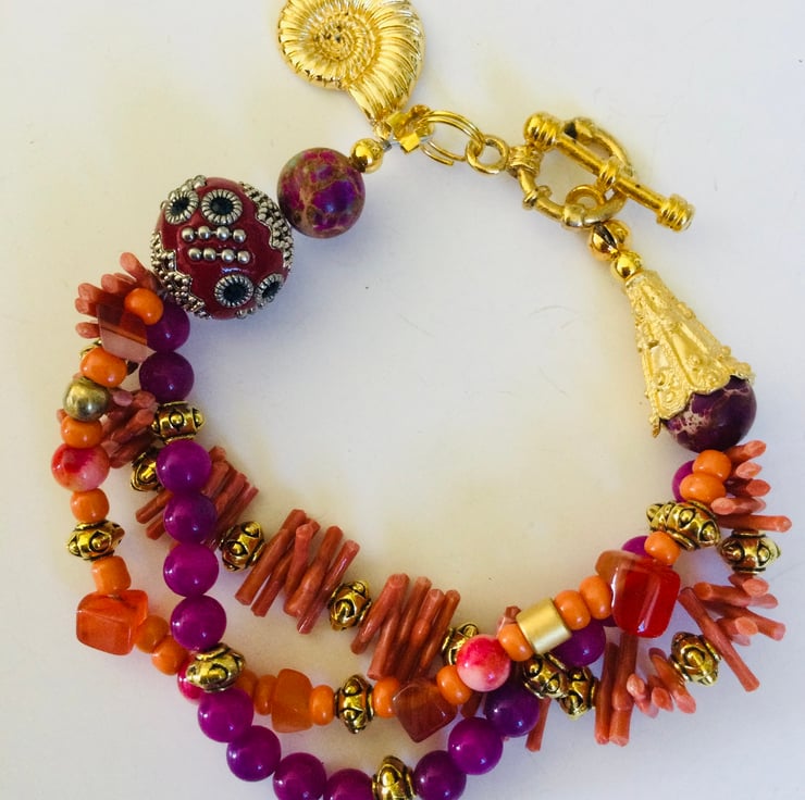 This three stranded semiprecious stone bracelet features coral, sardonyx, dyed red jade and a contrasting strand of purple sugulite. It is finished with two purple imperial jasper beads and a large decorative silver and red enamel bead from Bali.