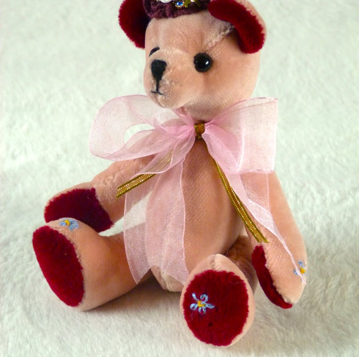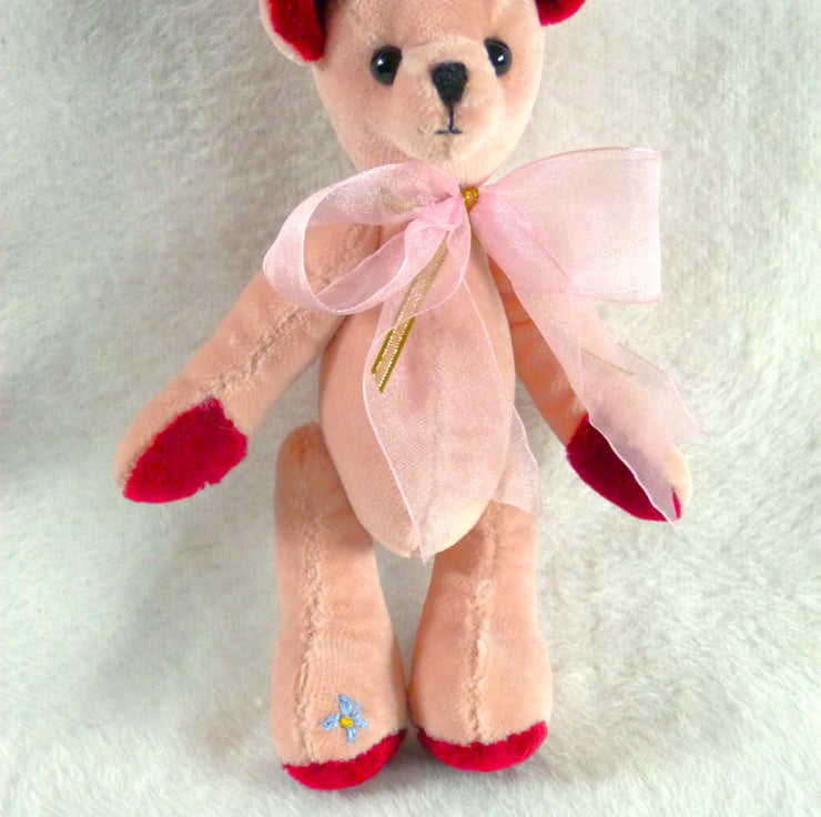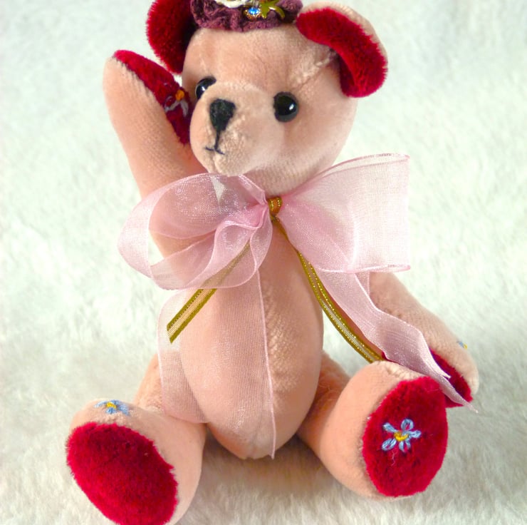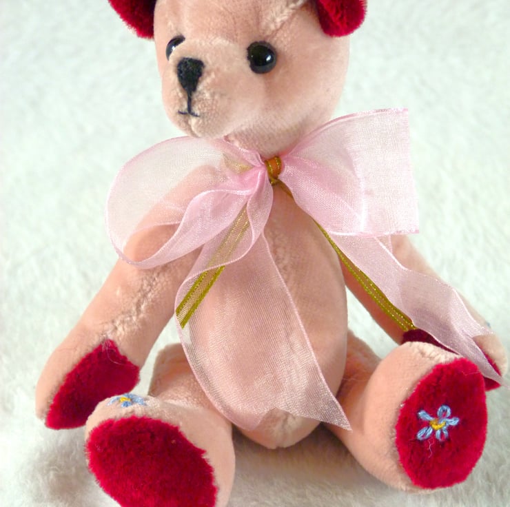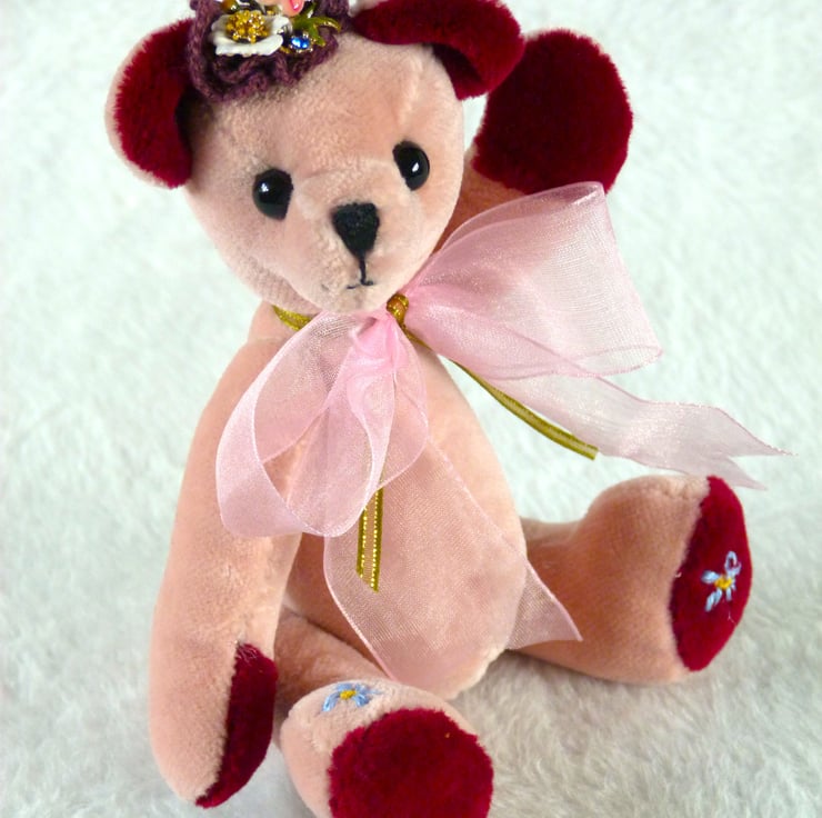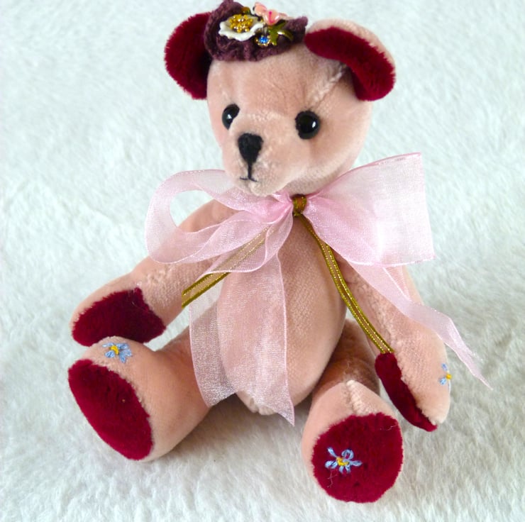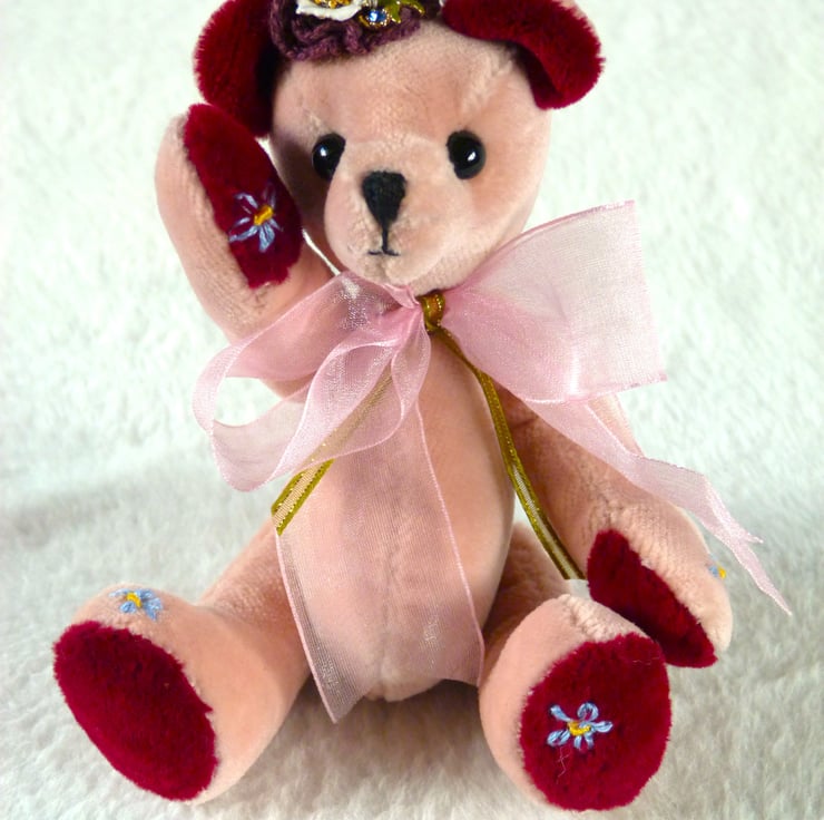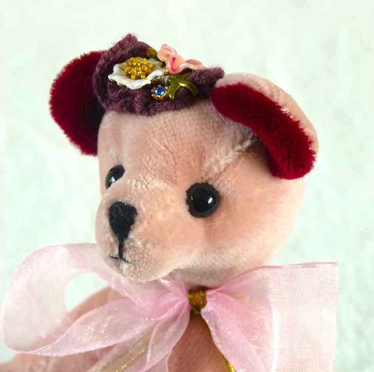 She has been hand crafted from pieces of vintage pale pink cotton velvet with paw pads and ears in a burgundy viscose velvet. Orchid is thread jointed in her arms and legs and a cotter pin joint for her head. She has English glass eyes, a sculpted face and embroidered facial features.