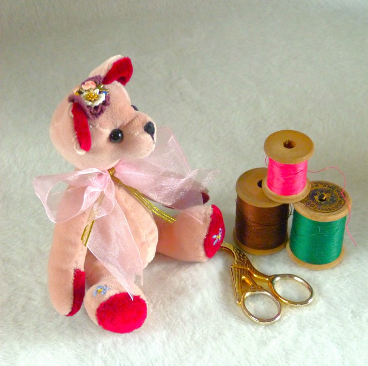 I have included a photo of Orchid alongside bobbins and scissors just to give an idea of scale on a smaller bear. These are not part of the purchase.