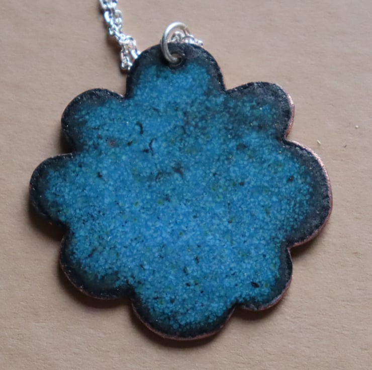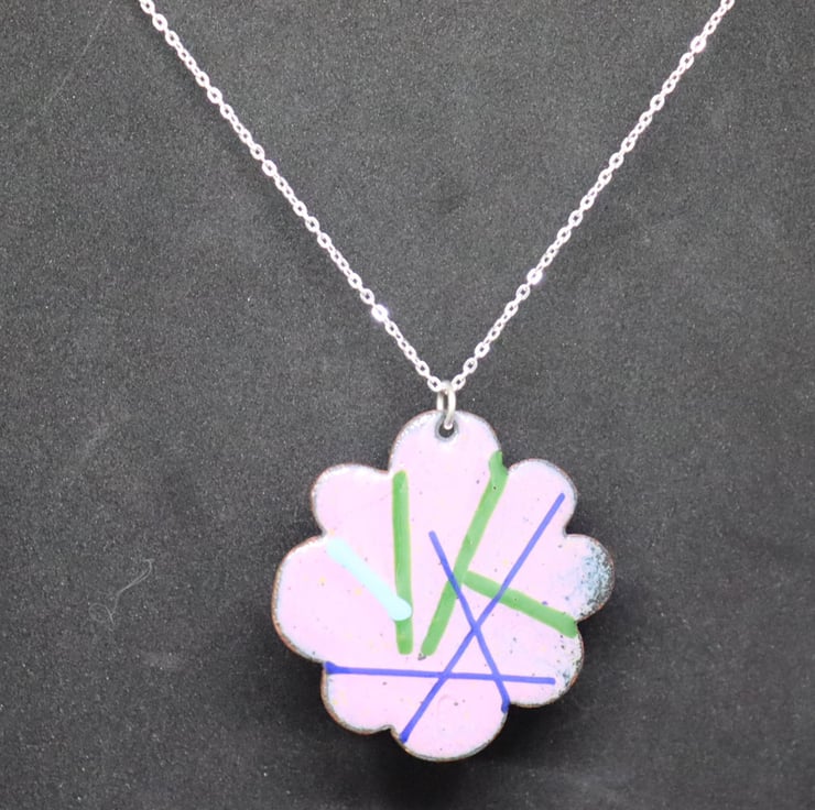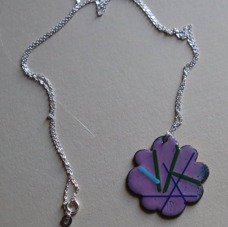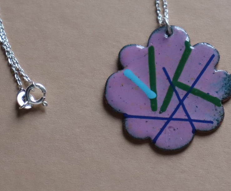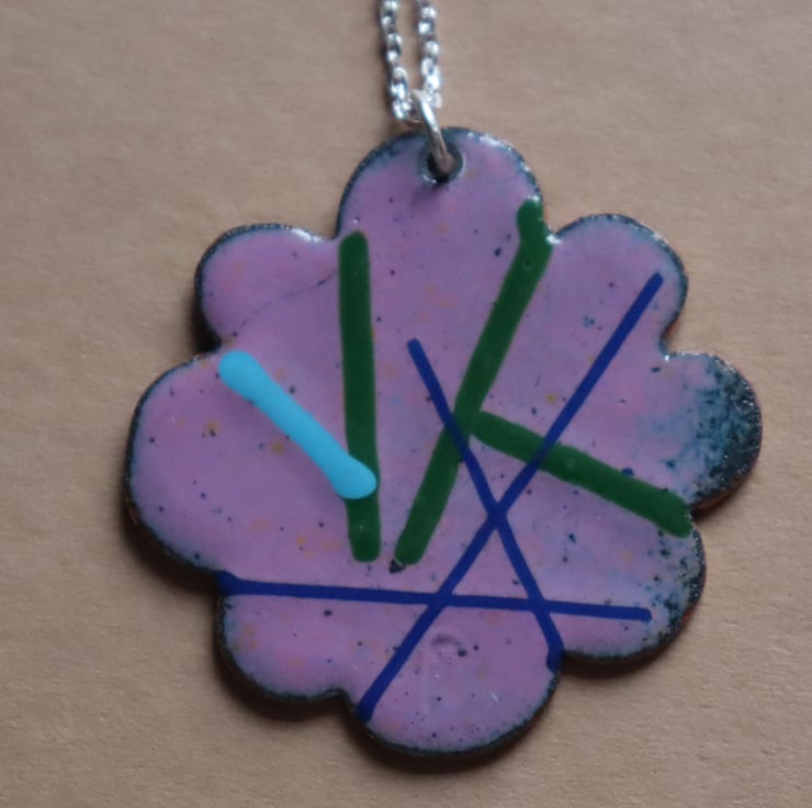 This pendant was made using a hand-cut copper flower shape. The flower was enamelled and kiln-fired with a base layer in heliotrope pink and counter-enamelled. It was then decorated with opaque enamel threads in a random pattern to create an abstract pattern and re-fired to fuse them to the base layer. The pendant is attached with a jump ring to a sterling silver trace chain. It measures 3cms x 3cms and the total necklace measures 28cms.