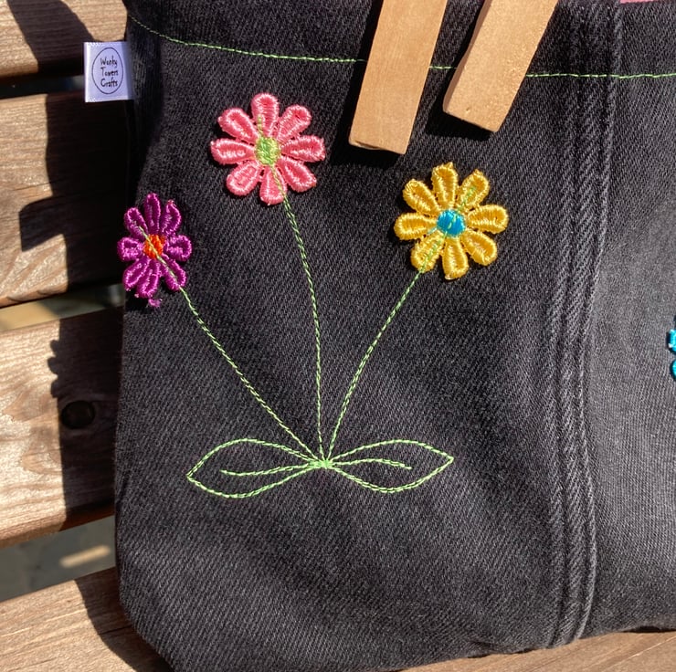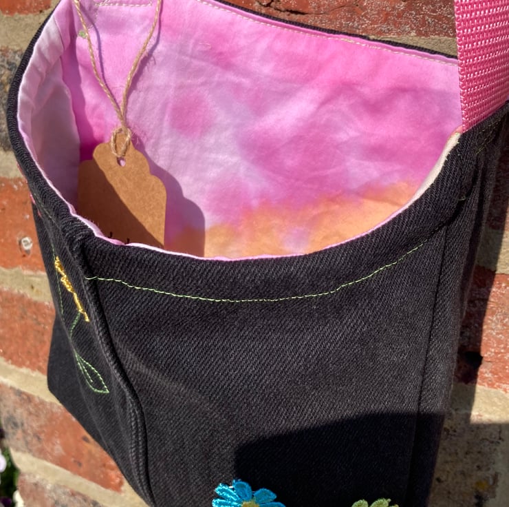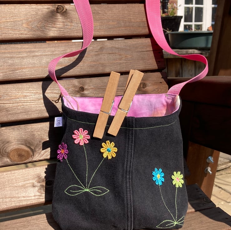 If you’re looking for a handy peg bag with a difference this may be the one for you. It is made from recycled denim. The front has been decorated with some colourful daisies. The lining is pastel-coloured tie-dyed cotton and the shoulder strap is bright pink. Wear this bag across your body for the most convenient experience of hanging out washing. A short length of boning holds the front of the bag open so that your pegs are always at your fingertips.