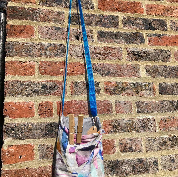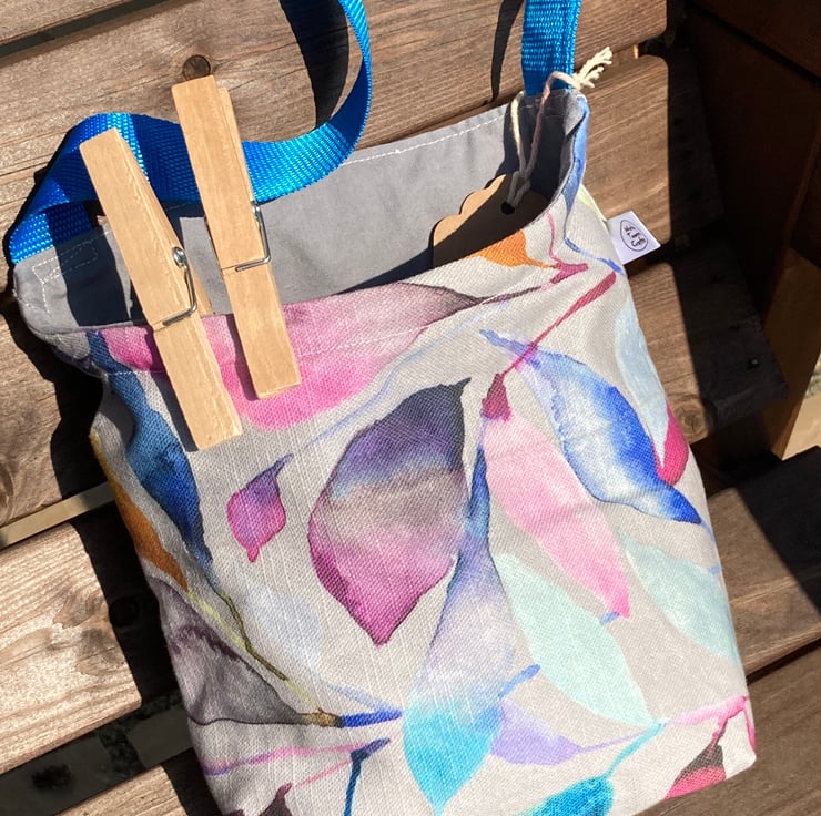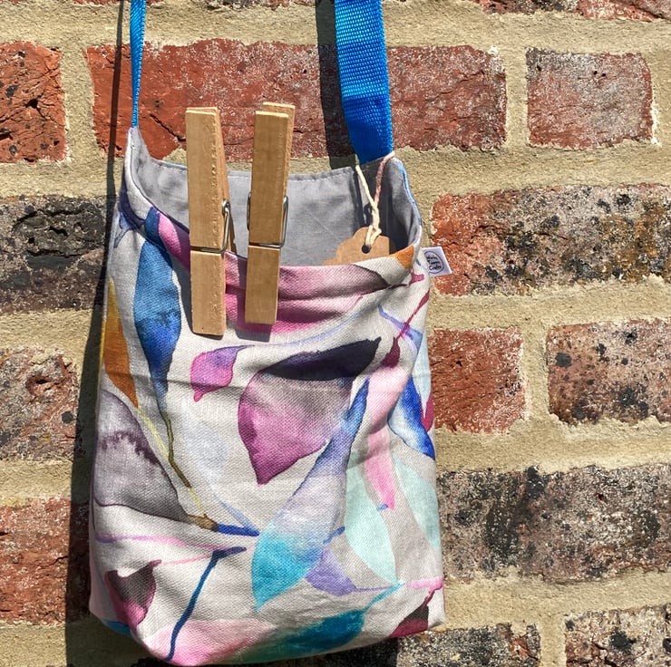 If you’re looking for a handy peg bag with a difference this may be the one for you. It is made from a pretty remnant of upholstery cotton. The lining is plain grey polyester-cotton and the shoulder strap is bright blue. Wear this bag across your body for the most convenient experience of hanging out washing. A short length of boning holds the front of the bag open so that your pegs are always at your fingertips.