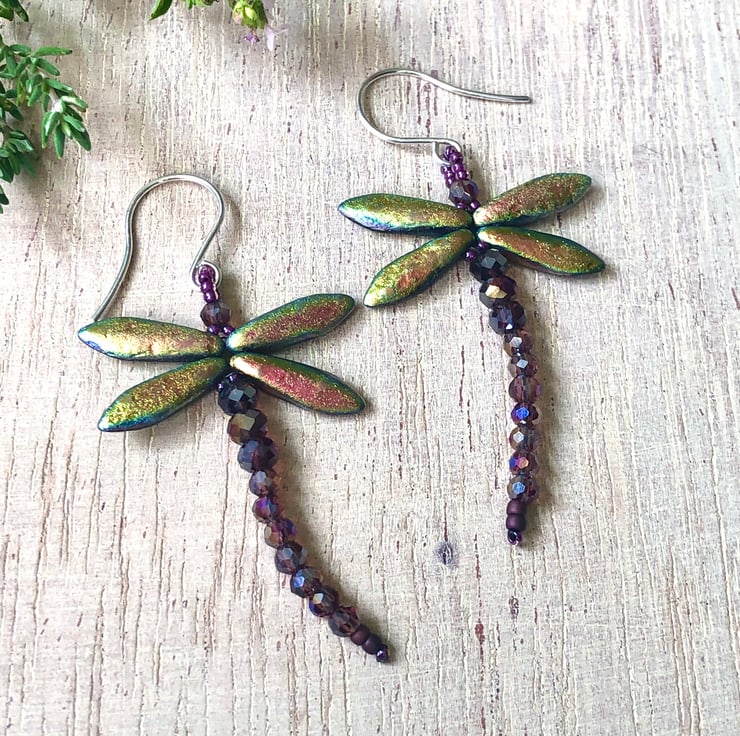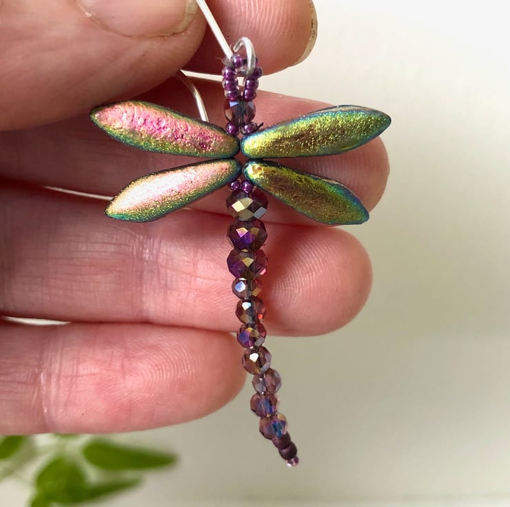 Beaded dragonfly earrings with gorgeous Czech glass beads for wings that shimmer just like a real Dragonfly, and change colour from pink to green to gold as the light catches them. I have added extra sparkle with AB coated purple glass crystal beads for the body that flash with hints of pink and gold. I have carefully hand stitched them together with high quality beading thread and finished them with handmade sterling silver ear wires.