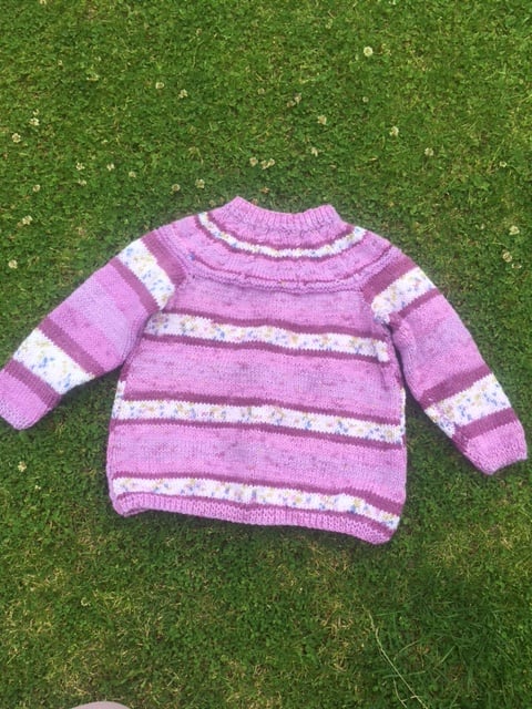 This soft and lightweight girls cardigan is knitted to fit a 3 - 4 years old and features a cables yoke. The purple random yarn knits up beautifully to give an attractive cardigan. The buttons are sparkly purple.