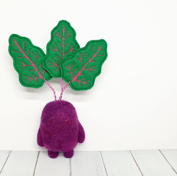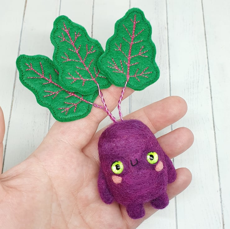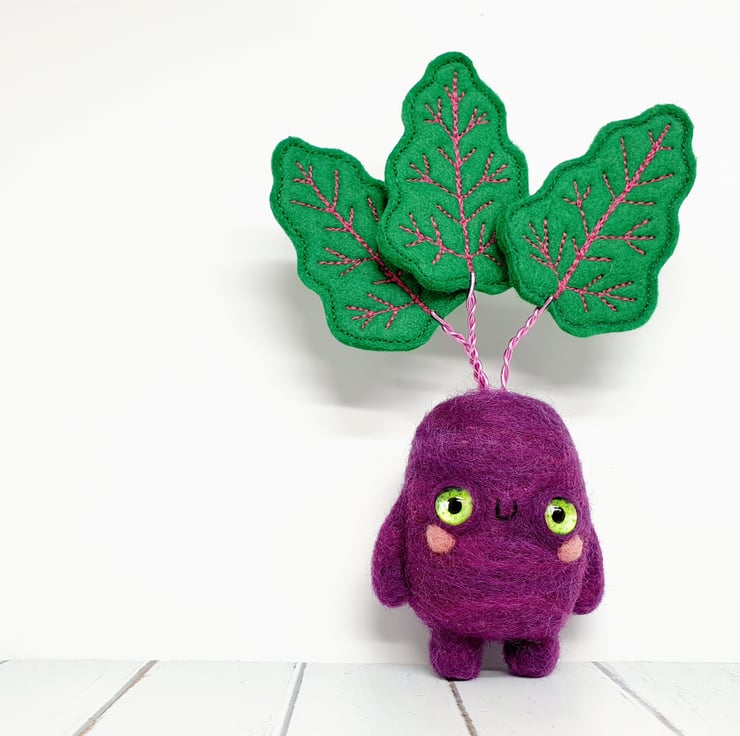 Miniature needle felted vegetable doll with glass eyes. This little one of a kind character has pink cheeks and multi tonal body with free motion embroidered leaves. Cannot stand unaided and needs to lean. This Beatroot measures roughly 14cm tall and 5cm wide. This is for decorative purposes only and not a toy.
