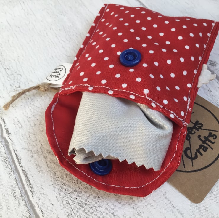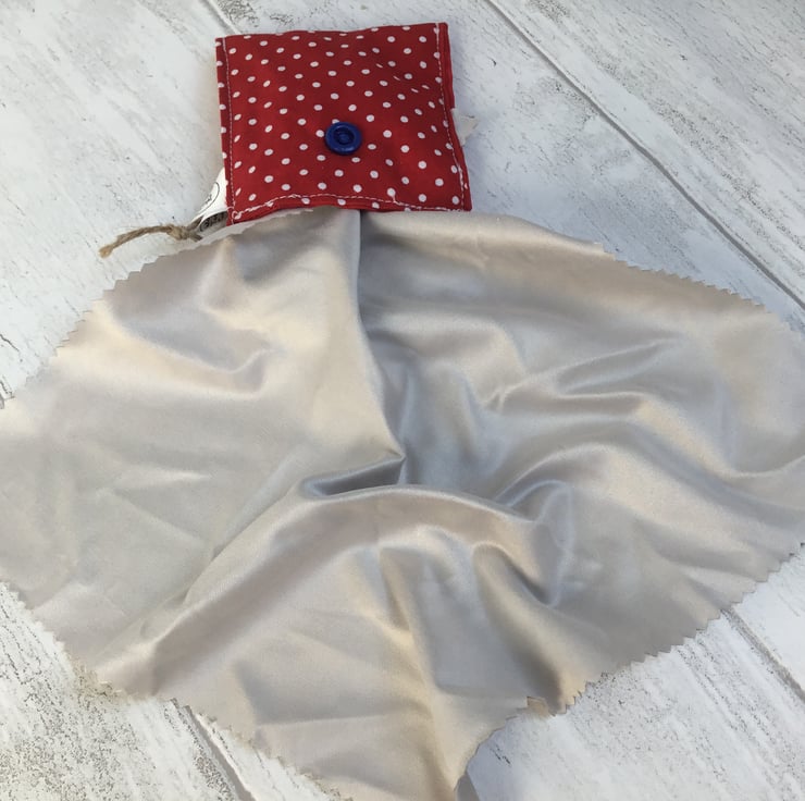 This tiny red pouch measures approximately 7 x 8cm. It is secured with a plastic snap. Inside the pouch is a large, grey microfibre cloth, measuring 21cm square. It is sewn into the seam of the pouch. When you need to clean your lenses, just pull the cloth out, leaving the pouch hanging. When you're done, fold the cloth and pop it back in - the silky lining of the pouch makes this very easy.