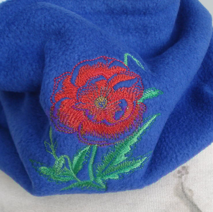 This is a double layered royal blue fleece cowl with a nice red poppy and green leaves embroidered on it. Really warm to wear under a coat and would make a great gift. Size: 22cm wide and 60cm wide approximately.