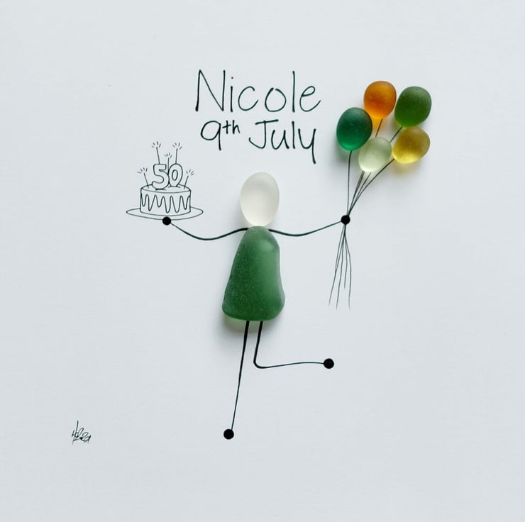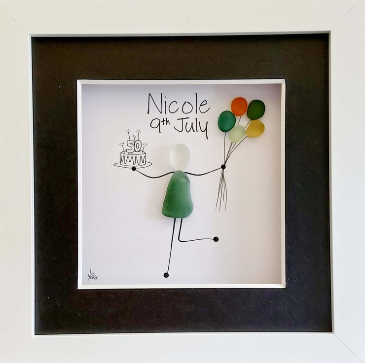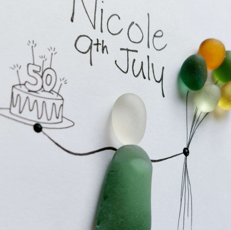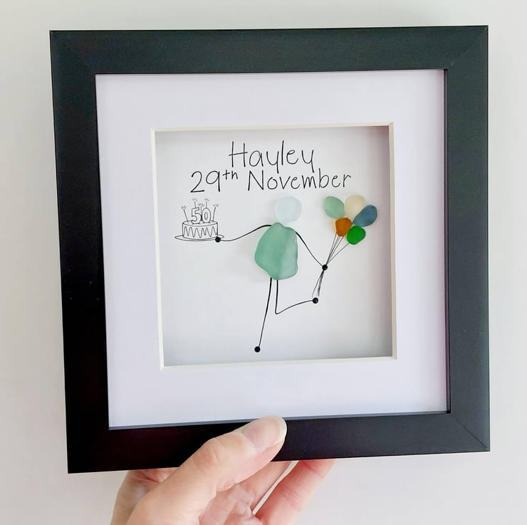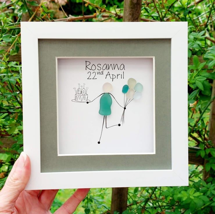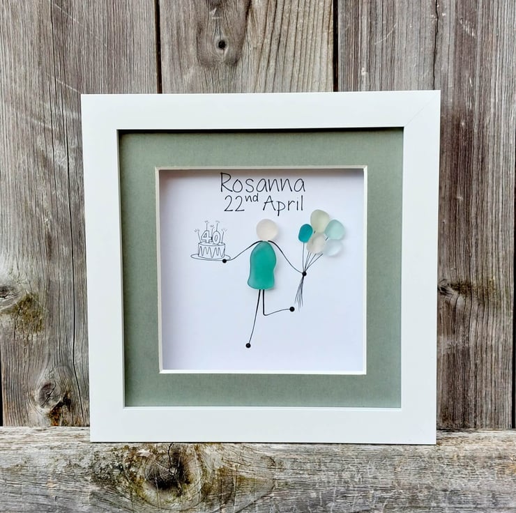 Order a hand made personalised birthday picture to celebrate your friend's special day! This design is crafted to order in your choice of a white, grey or black 17.5cm frame with hand written names, date and special candles if required. It is quirky, fun and a perfect way to celebrate a special birthday. It will be made to order for you using sea glass I have collected from my beachy travels - add your own details for a truly wonderful gift.