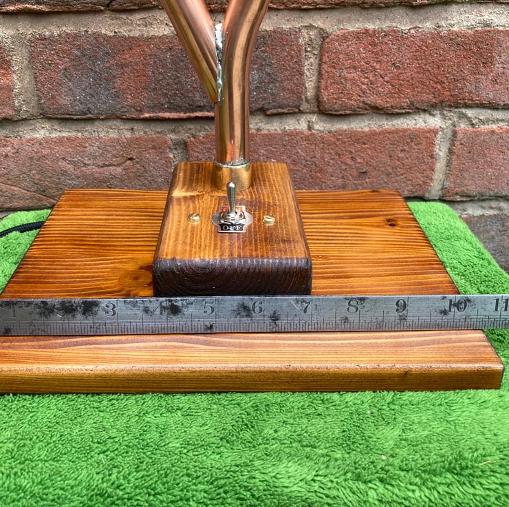 All joints in the copper pipework are soldered together so there may be some surplus solder around the joints and as the copper pipe is reclaimed it comes with some marks from its previous life. Once soldering was finished, the wiring was run through the pipework. The lamp is secured onto a base made from reclaimed wood which I have sanded, stained and French polished to give a nice sheen, it has an integral toggle switch and stands on four felt pads to protect your furniture. Power is supplied through 6 feet/1.8 metres of luxury Italian made black braided flex with a black British plug with the correct 3a-amp fuse.