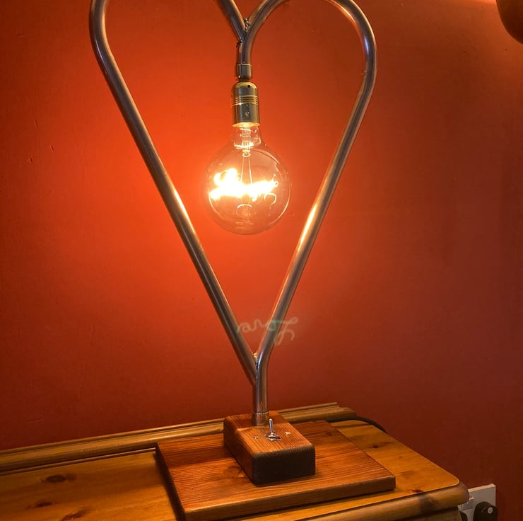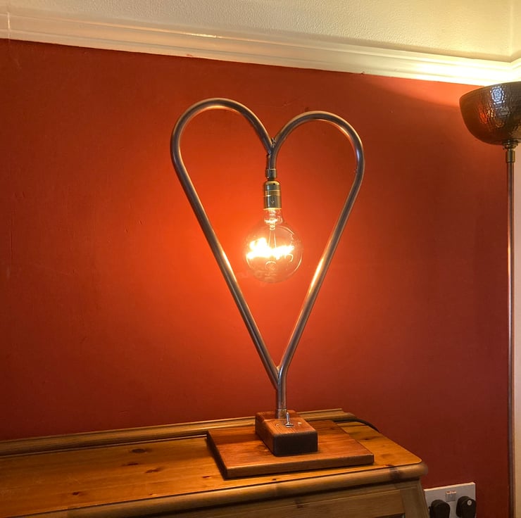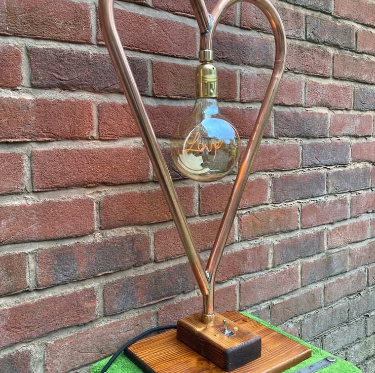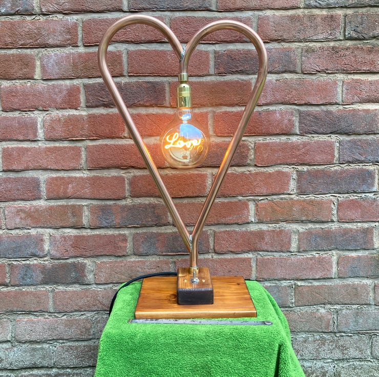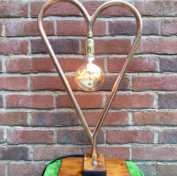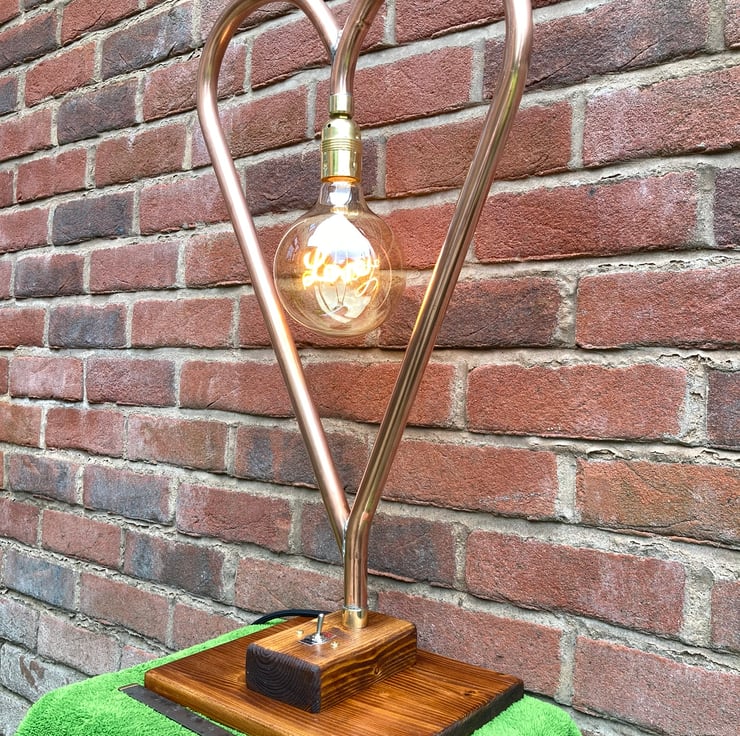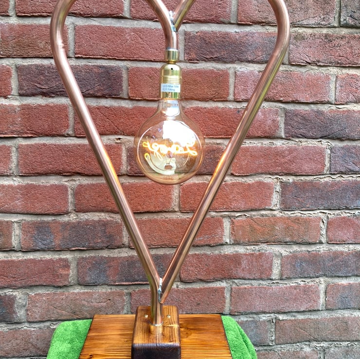 A striking table lamp, made from repurposed copper water pipe, which combines contemporary, industrial and steampunk styles. I have formed a heart shape from 22mm copper pipe, secured it to a wooden base and fitted a new brass ES lampholder to hold a Four Watt LED globe lamp with its filament in the shape of the word ‘love’ in the heart. This reflects light from the polished copper to form an attractive effect.