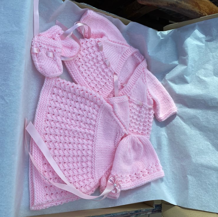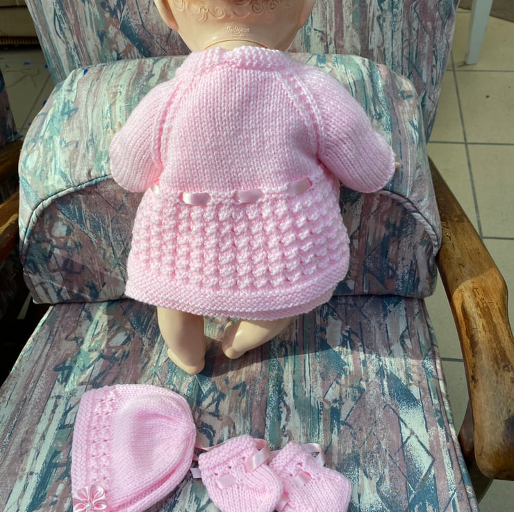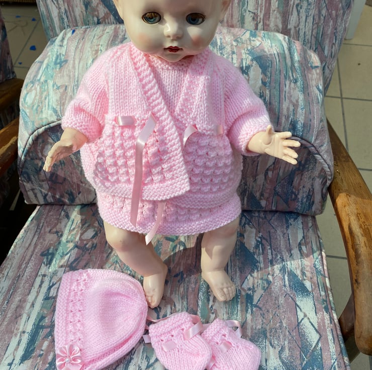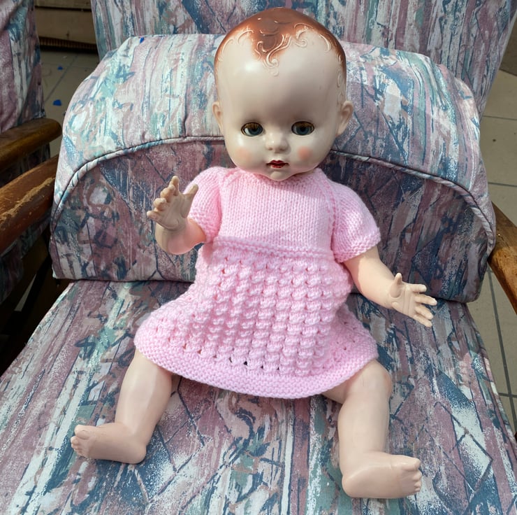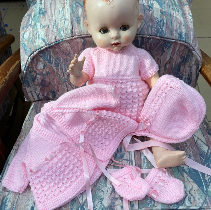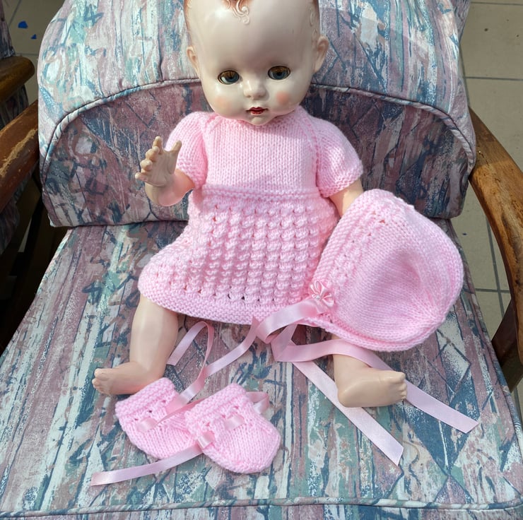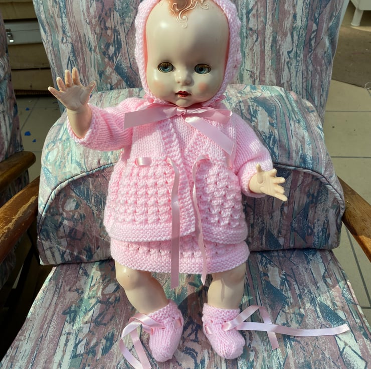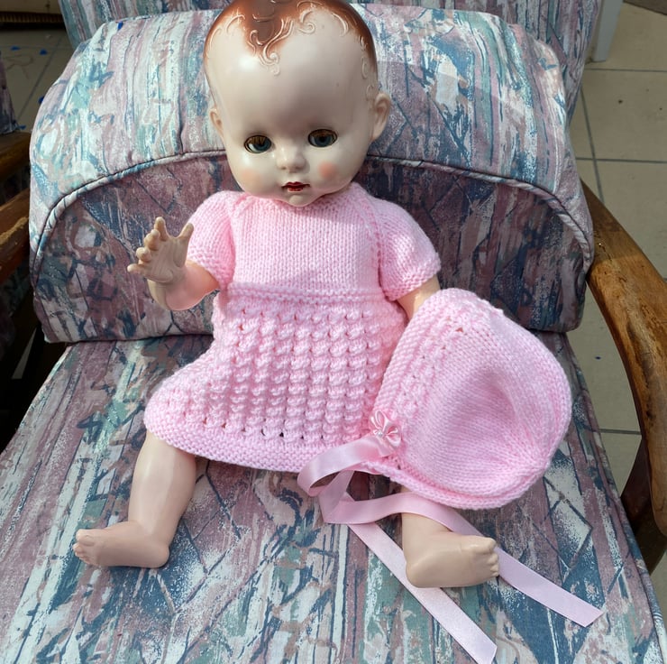 A Dainty dress, coat, bonnet and bootees to give your hard plastic doll, such as my Pedigree model, a new outfit for her birthday. I knitted this 5 piece set from a vintage pattern my sister in law used, to knit clothes for my dolls when I was a child, in the fifties. This particular set fits an 18” long, bent-legged baby doll, with a 13 1/2” - 14” tummy and a 15-16” head circumference.and is shown on my model which is not included, just the clothes. You might have a different doll in a similar size to buy a nice dress and jacket set for and of course the jacket can be worn over a fabric dress, with or without the bonnet and bootees. It comes in a postal box which will be handy to keep your dolly’s other outfits in.