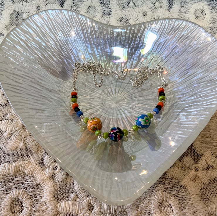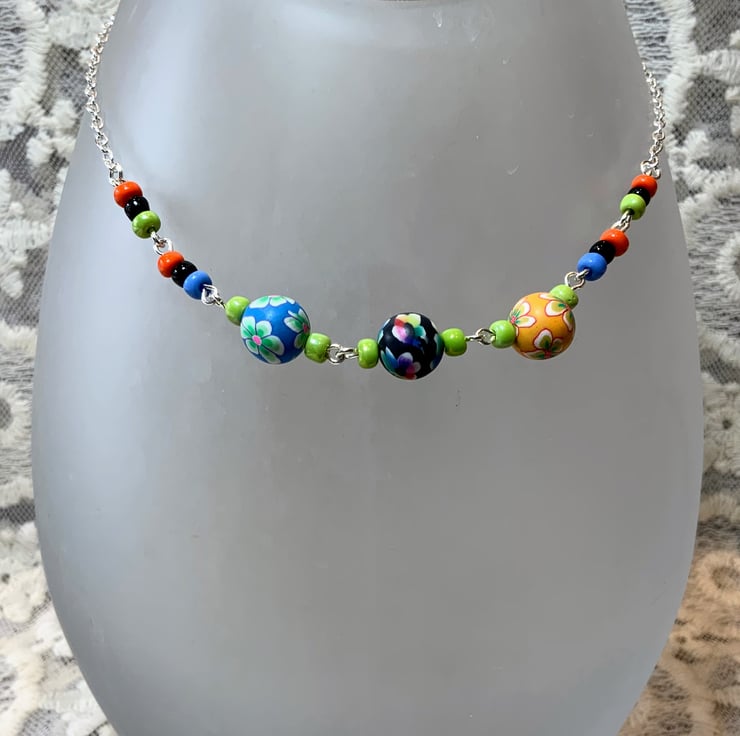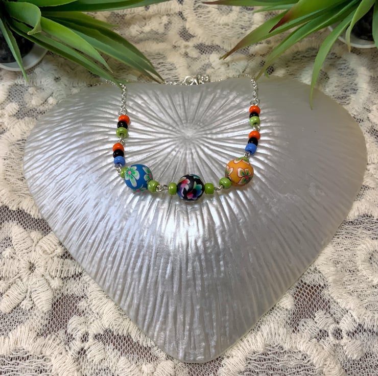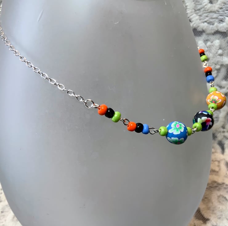 Clay flower bead necklace and mini glass rochelles in bright cheerful colours on a silver plated chain with silver metal lobster clasp. The beads frame the front of the necklace. Hanging on a silver plated chain that hangs at 16 inchs which is a standard childs necklace length .This necklace will fit a child from the age of five to 12 years .