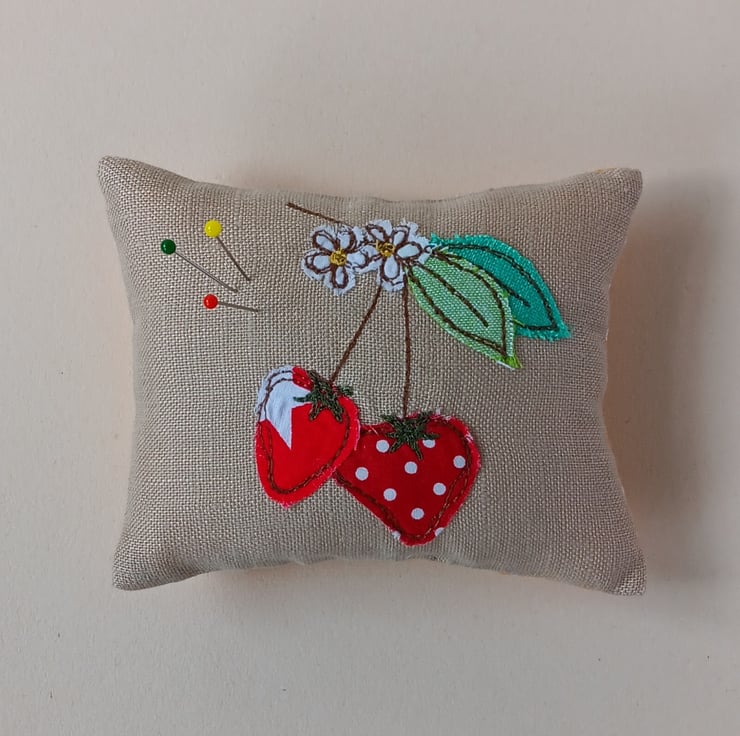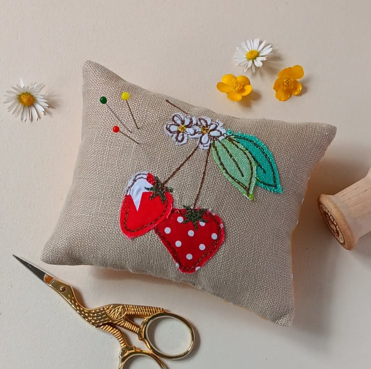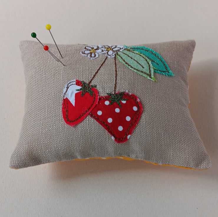 A sweet little pin cushion with a summery design, perfect for brightening up any sewing table. On the front is a design of strawberries, made by appliqueing snippets of fabric onto beige linen and sewing them using free motion embroidery. The back is a sunshine yellow spotty cotton. The pin cushion measures approximately 12cm wide and 10cm high and is filled with hollow fibre stuffing.
