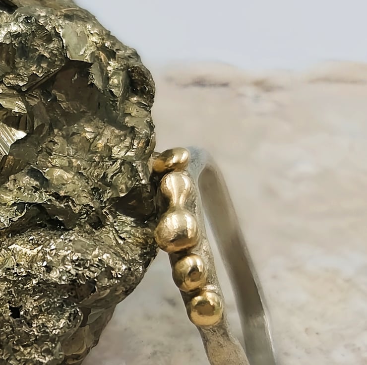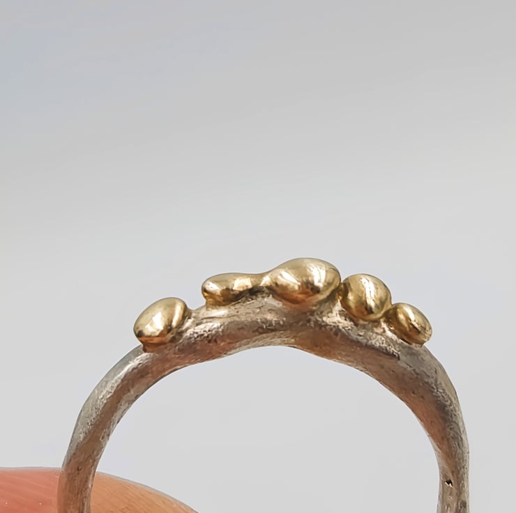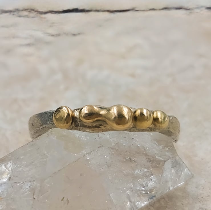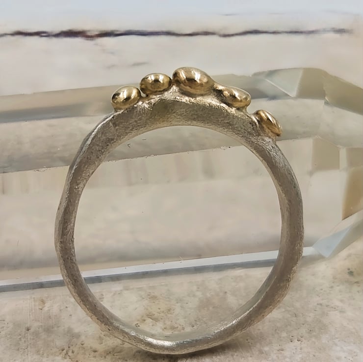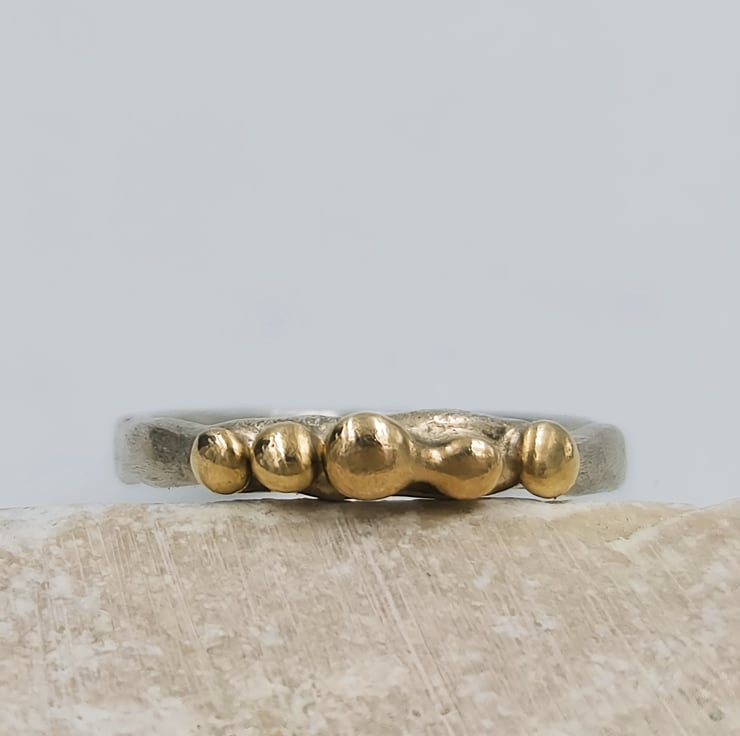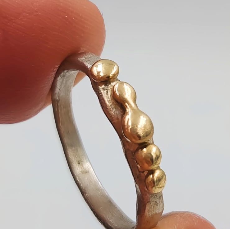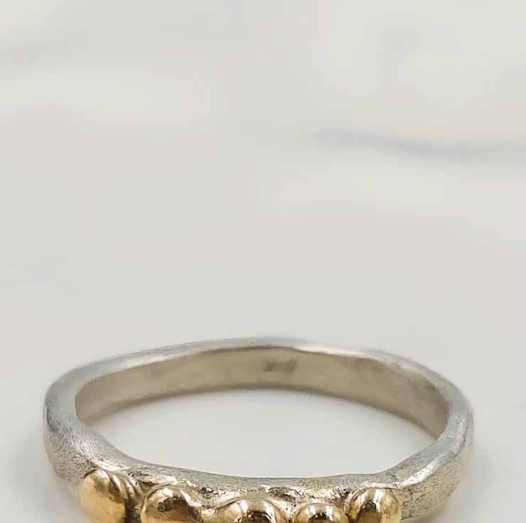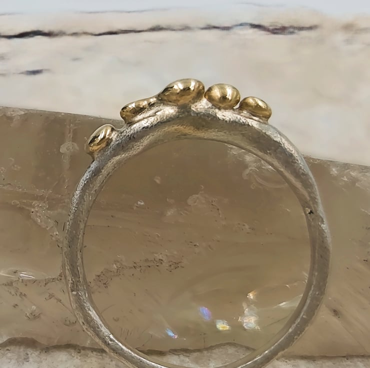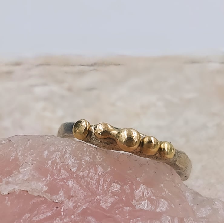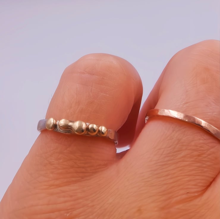 Elevate your style with this exquisite Molten Silver Pinky Ring, adorned with five stunning 9ct gold granules. Crafted from premium sterling silver, this delicate piece showcases a unique molten texture that perfectly complements the luxurious gold accents. The slim band is designed for comfort and elegance, making it a versatile addition to any jewellery collection. Whether you're dressing up for a special occasion or adding a touch of sophistication to your everyday look, this ring is a timeless accessory that exudes charm and elegance.