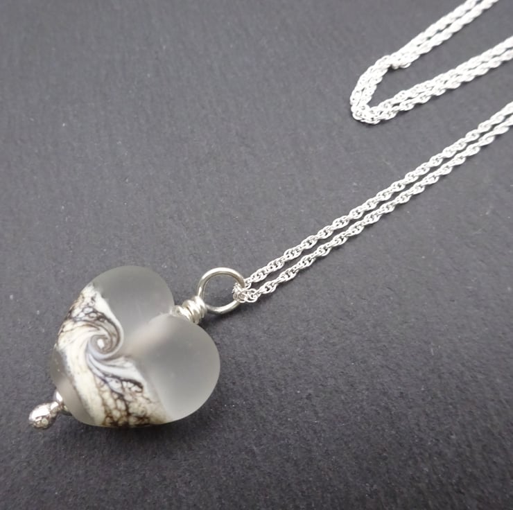 A sterling silver chain which features a handmade lampwork glass heart pendant.