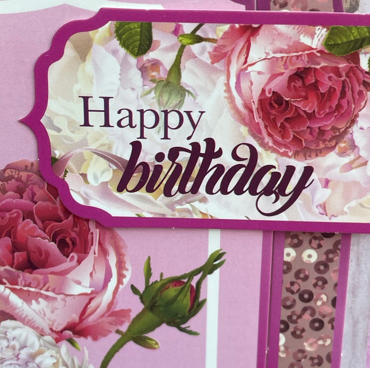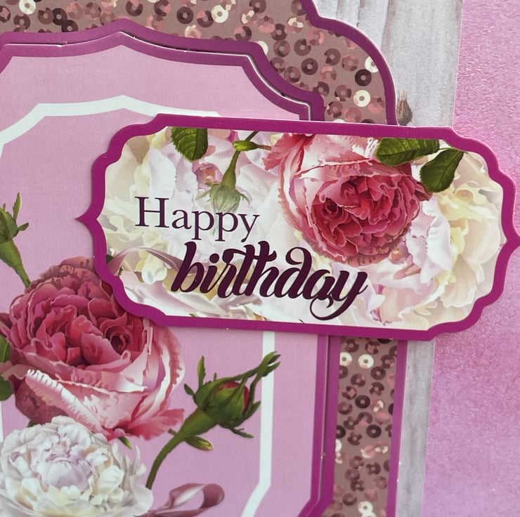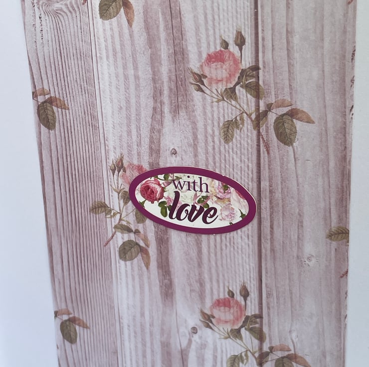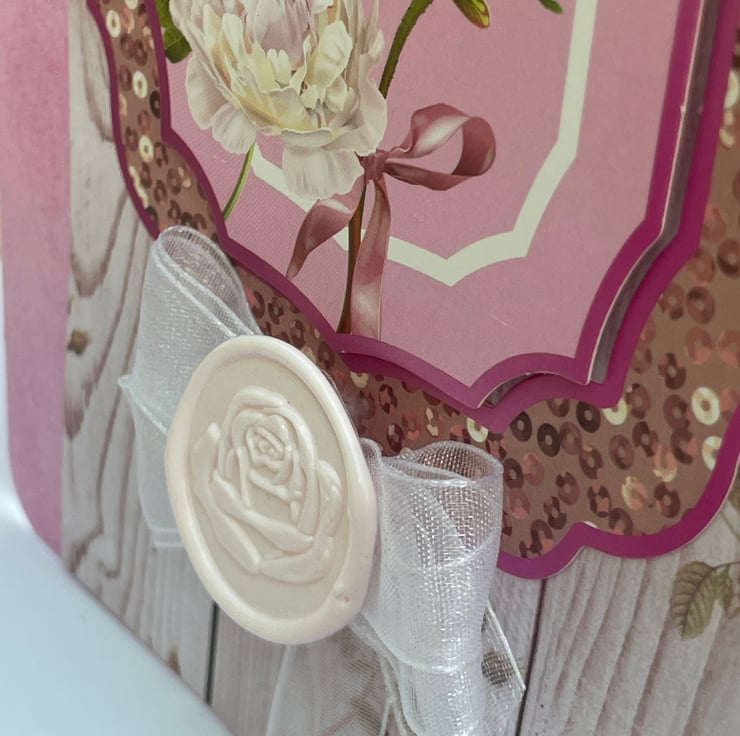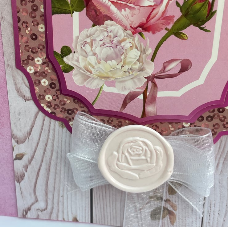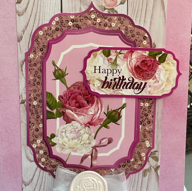A beautiful feminine birthday card. This A5 sized card is a beautiful pink feminine design. The background card is a pale pink cloudy card. This is topped with a pale pink wooden plank effect paper with rosebud design. The main design is a fancy label shape frame with a faux sequin effect. The inner design is of 2 large old fashioned roses. There is a matching greeting that says Happy Birthday. The design is finished with white organza ribbon and an organza bow. This is topped with a pale pink wax seal with a rose impression. Inside the card has matching paper and the greeting With Love.