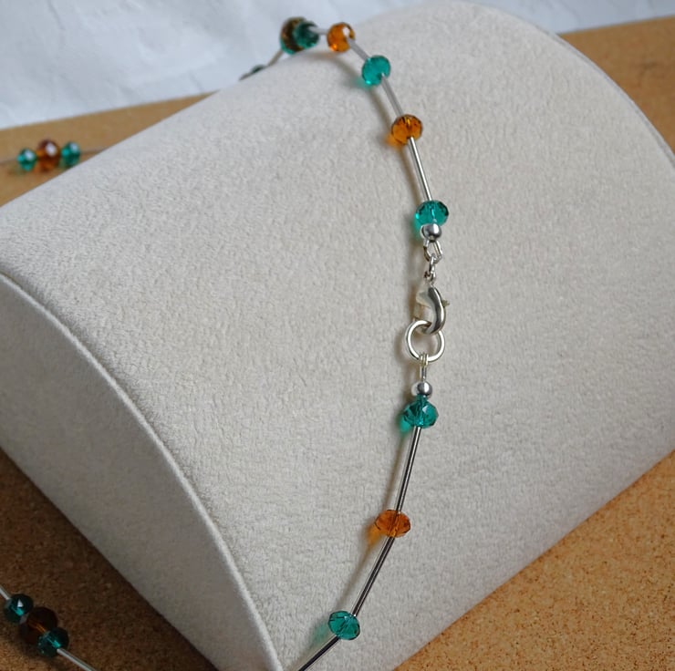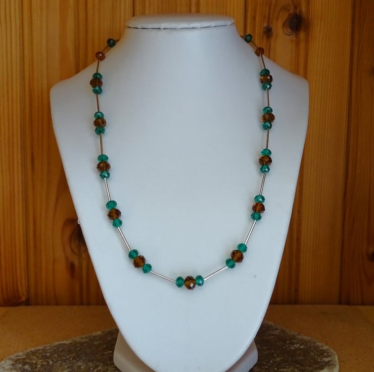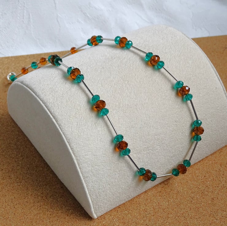 This necklace is made with green and orange faceted glass beads and silver plated tubes. It is secured with a silver plated lobster clasp fastening.