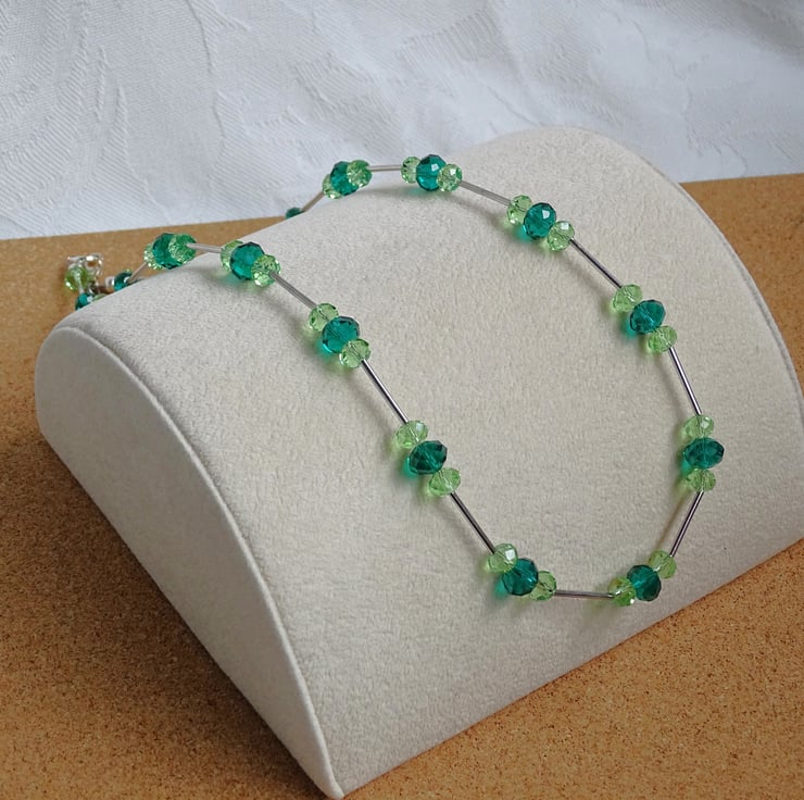 This necklace is made from faceted glass beads in two different shades of green, together with silver plated tubes. It is secured with a silver plated lobster clasp fastening.