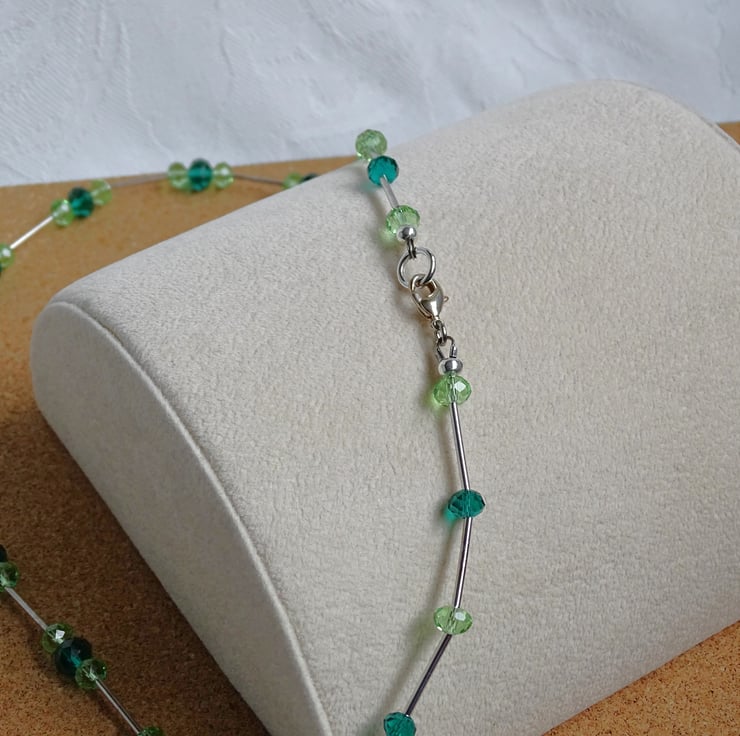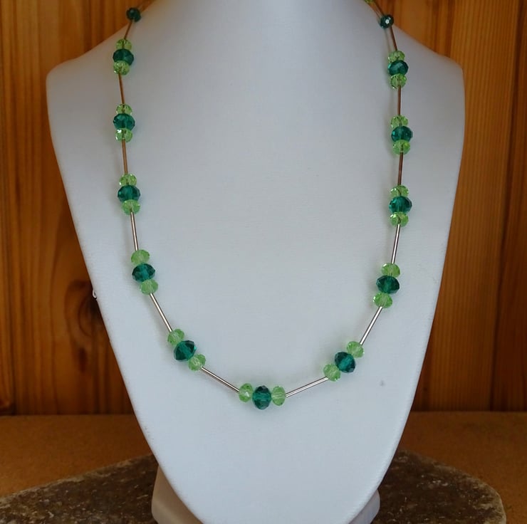 This necklace is made from faceted glass beads in two different shades of green, together with silver plated tubes. It is secured with a silver plated lobster clasp fastening.