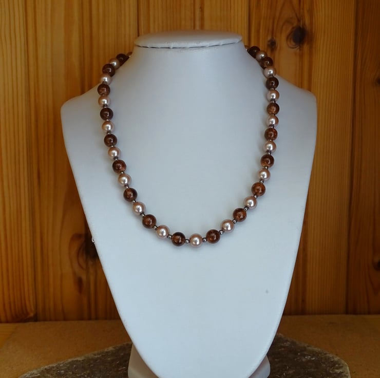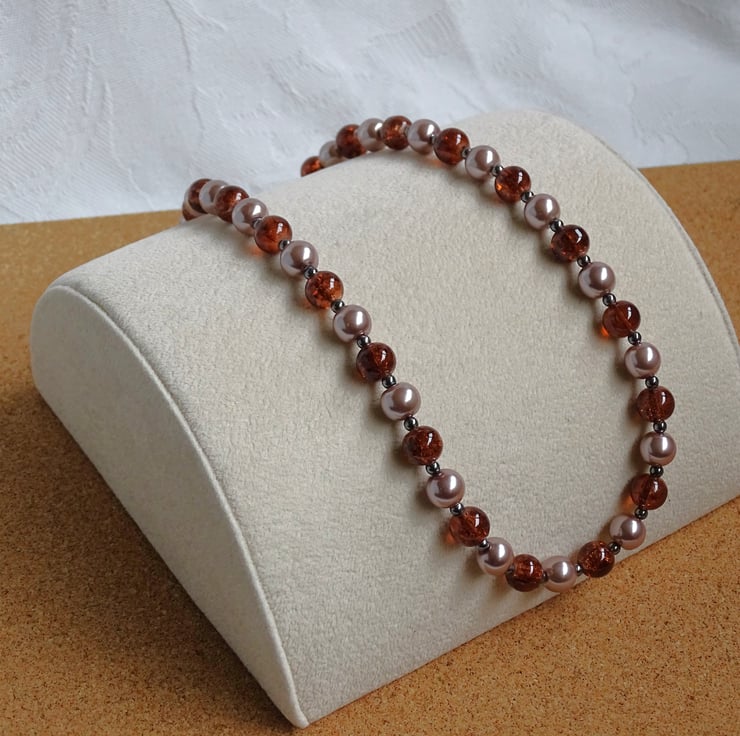 This necklace is made with brown crackle glass beads, beige glass pearls and small sterling silver spacer beads. It is a secured with a sterling silver lobster clasp fastening.