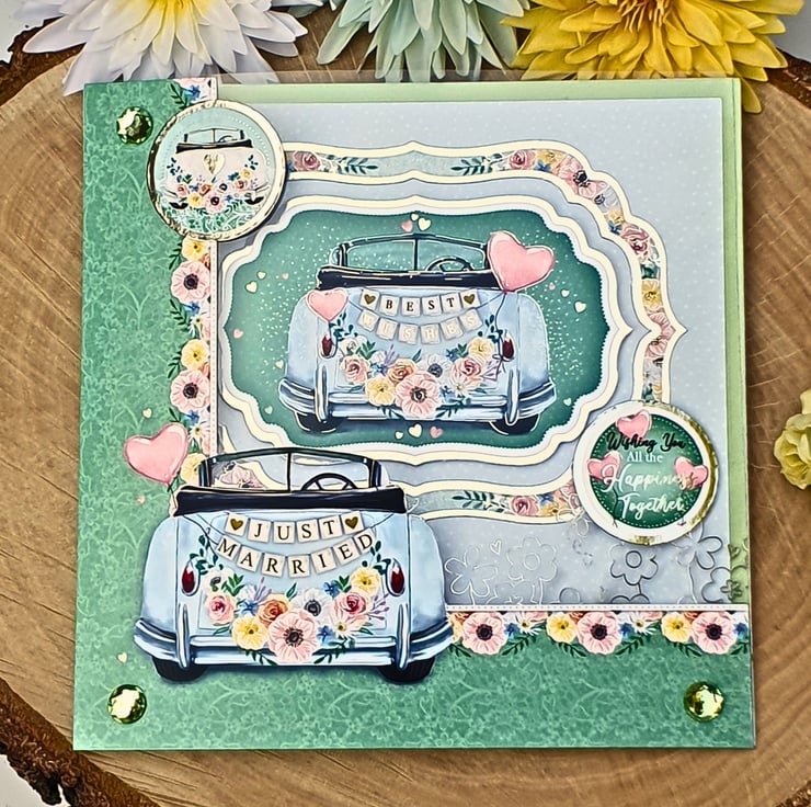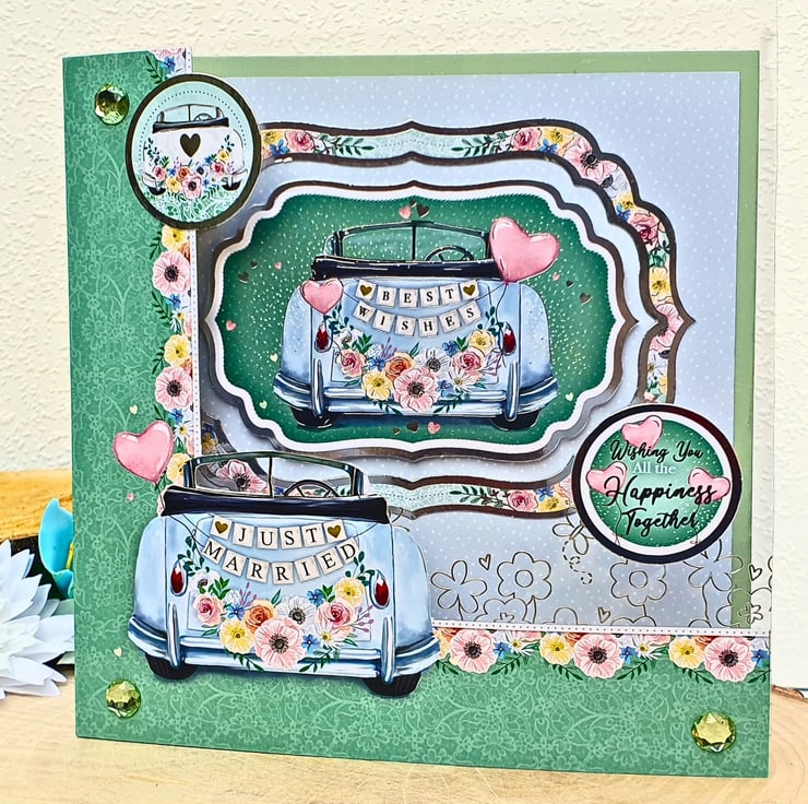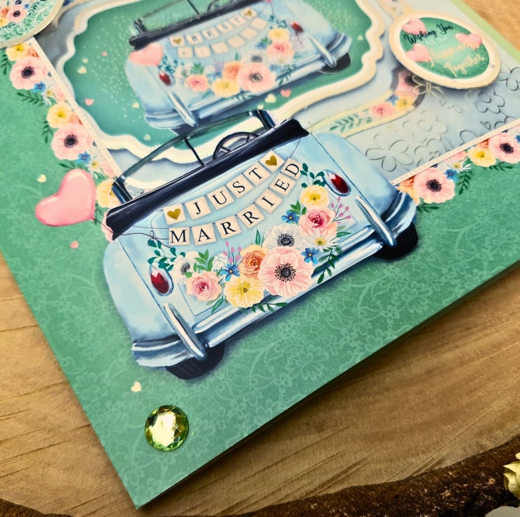 A handmade keepsake card for the wedding day of a couple, in soft pastel green tones, displaying the very popular image of an open car, decorated with a "Just Married" banner, flowers & heart balloons!