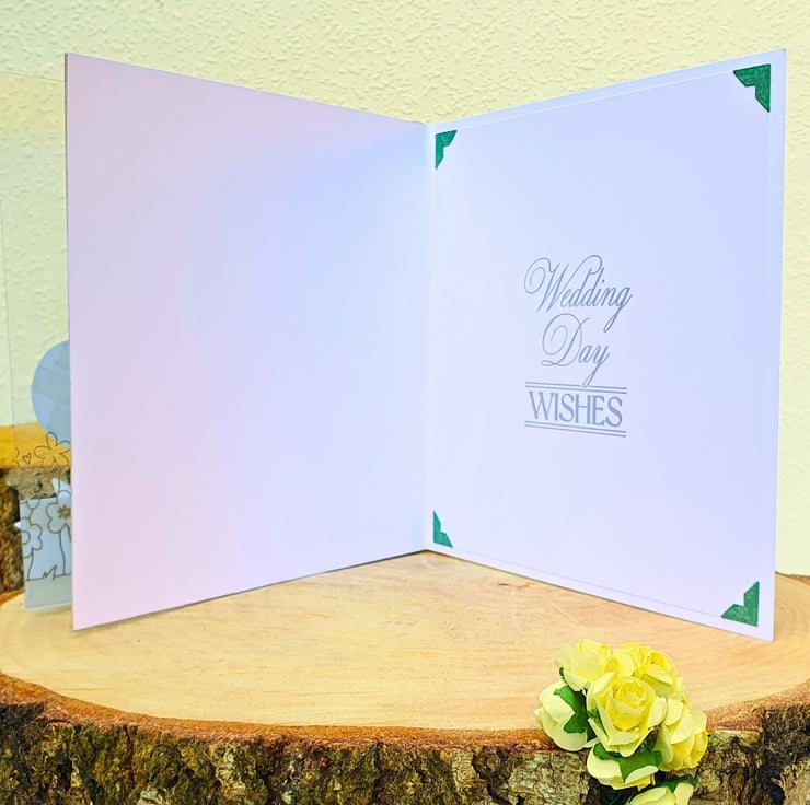 This unique card is made with 3 pages. The front page is made of acetate with foiled flowers, silver on the front & gold at the back. It is layered with a decorative corner panel & 2 button tags, of which one reads the sentiment "Wishing you all the happiness together". It is embellished with green gemstones. The 2nd page is made of matching dotty cardstock & mint green card layered on the white card base. It displays a silver foiled topper of an open car, decorated with a "Best wishes" banner. The 3rd page accommodates the insert, that has the silver foiled sentiment "Wedding Day Wishes".